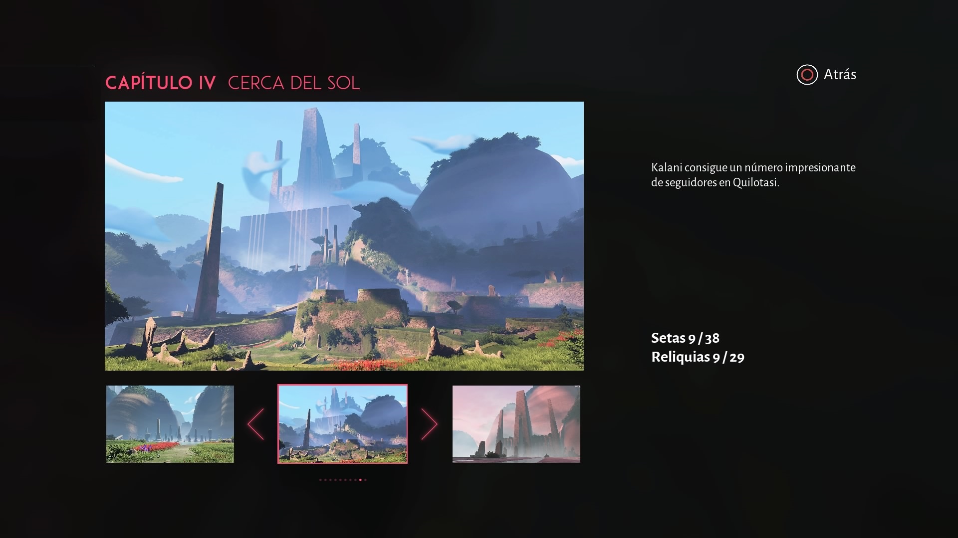 El juego se divide en 7 capítulos y en cada uno de ellos iremos conociendo la historia de Kalani, y en el menú de los capítulos podemos ver las reliquias y setas que hay en la zona. Desde que obtiene su nombre hasta su final de forma progresiva (aunque el primer recuerdo es de los últimos, el resto es secuencial). El juego cuenta con autoguardado, que suele hacer con bastante frecuencia.