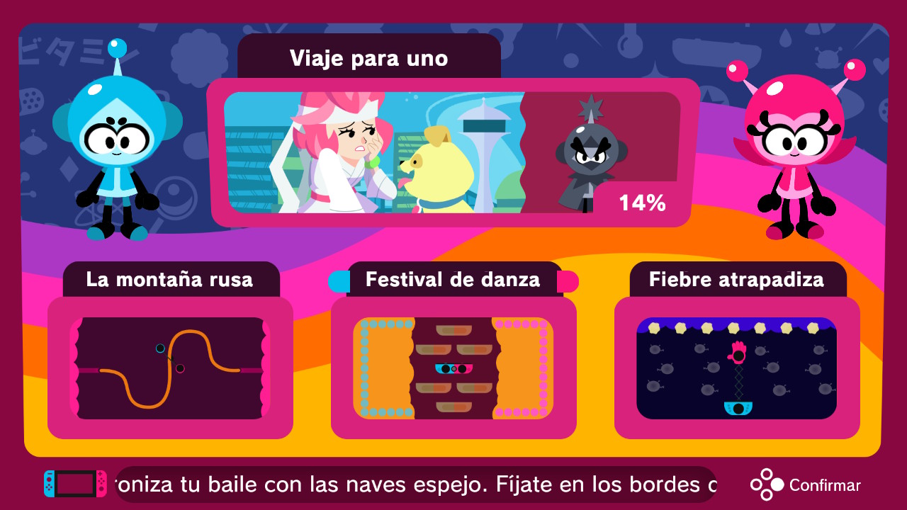 - Festival de danza. Tendremos que seguir el ritmo y marcar en el momento exacto la opción que nos indique el juego. Estas acciones son: dar palmas, mover la nave arriba o abajo y girar la nave. Tendremos que pasar tres pases para completar el minijuego.