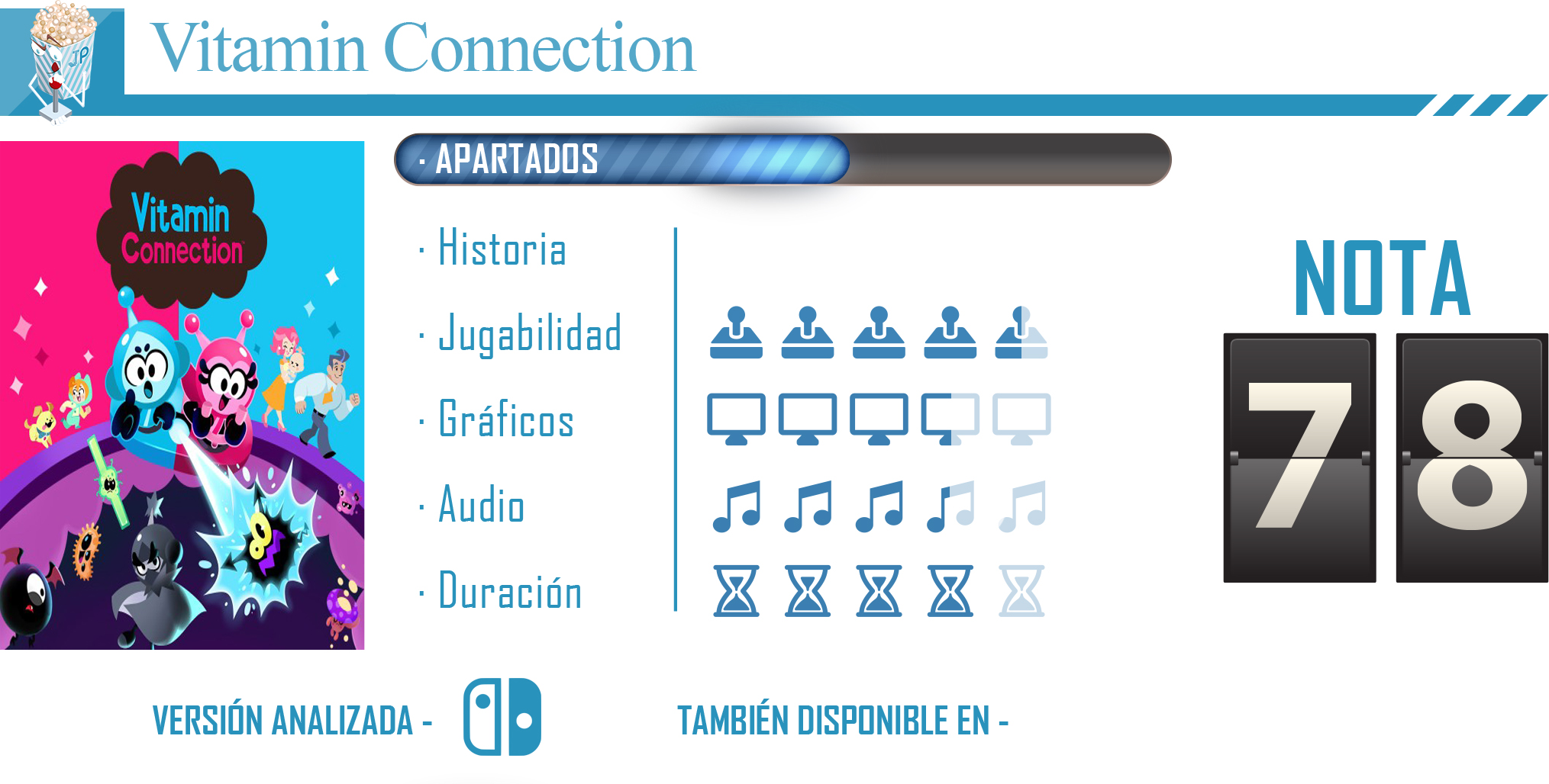 Vitamin Connection es un juego muy llamativo y entretenido, y que con su sencillez y manejo fácil hace que sea para toda la familia, tanto si eres adulta como si es para los y las peques de la casa. Además, al tener el apartado de los minijuegos y los récords de tiempo, tiene bastante rejugabilidad, aunque no se puede estirar mucho debido a que es fácil pillar el truco. Tiene una buena relación calidad-precio. Y recordad, niños y niñas, si veis pastillas por ahí no os la toméis ni las tiréis por ahí, decir no a la automedicación.