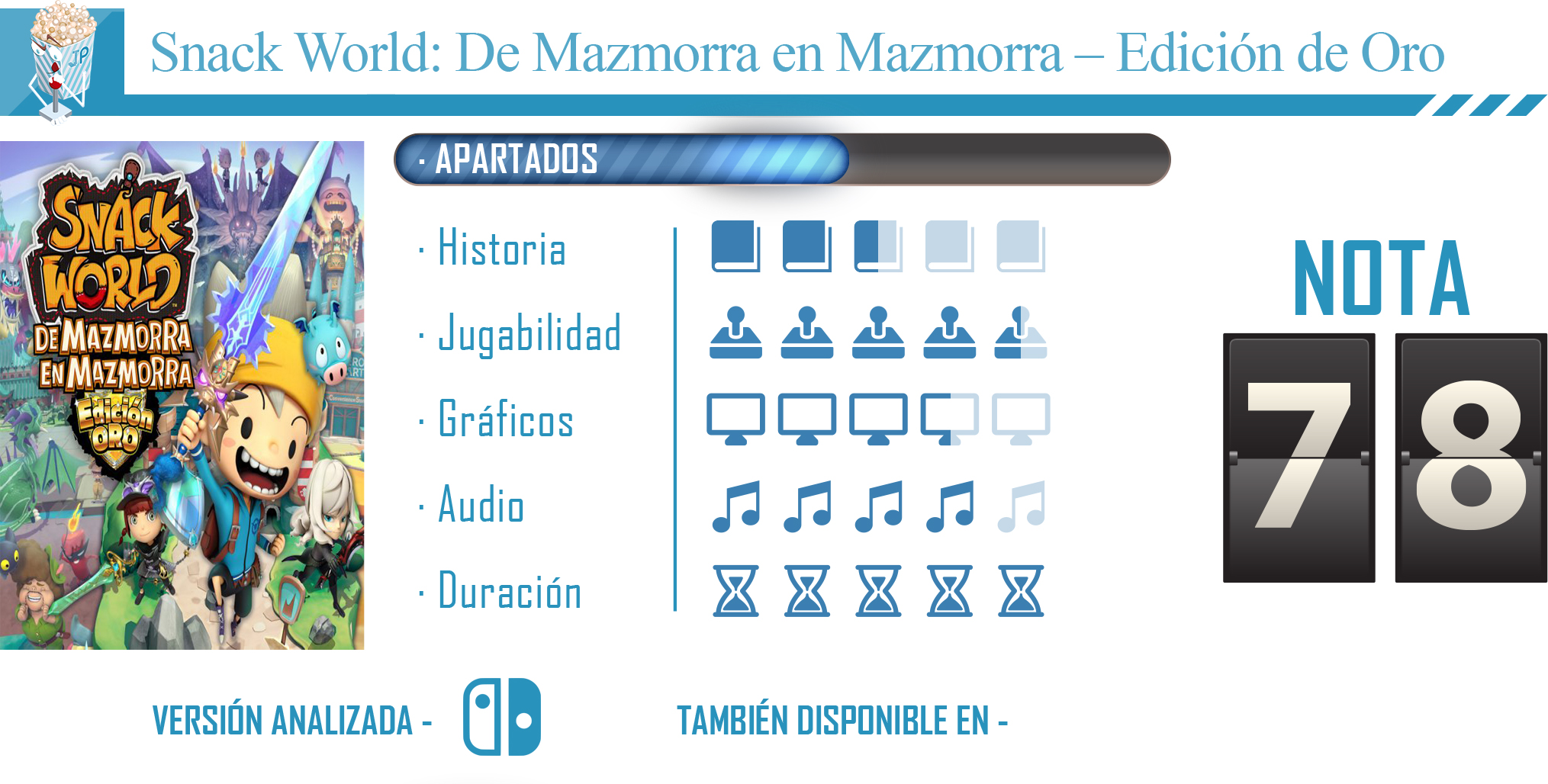Snack World: De mazmorra en mazmorra – Edición Oro es un título recomendable para los que busquen un RPG desenfadado y con el que pasar un buen rato. Su funcionamiento es simple e intuitivo, pero esto hace que sea realmente accesible para todo tipo de jugador, desde los más pequeños hasta los más experimentados. Además, el título de Level-5 esta repleto de contenido que descubrir y de aventuras por vivir, lamentablemente se echa en falta ese modo multijugador cooperativo local que nos hubiera permitido explorar las mazmorras del juego con nuestros amigos.