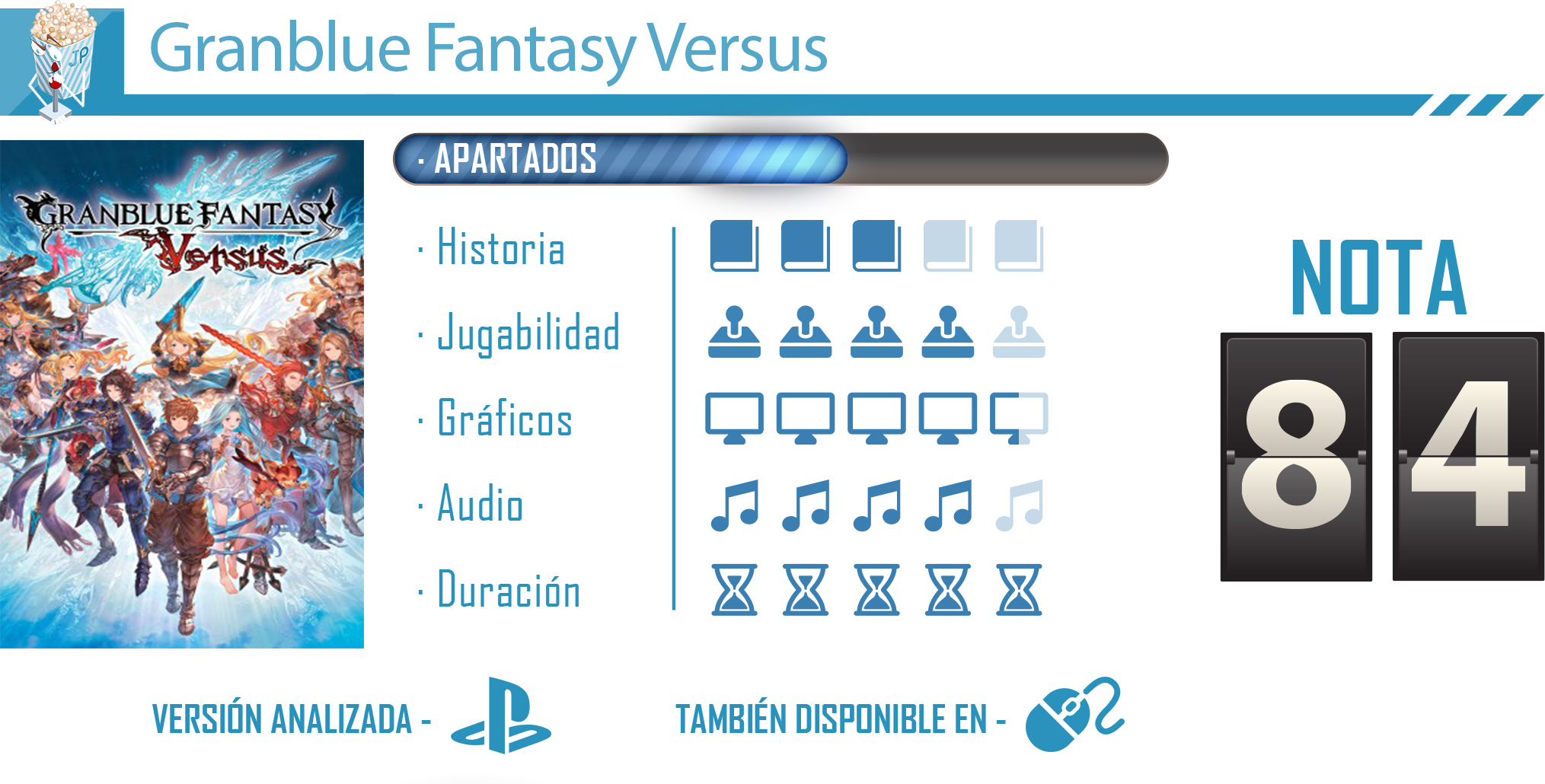 En Granblue Fantasy Versus nos encontramos con un juego de lucha muy dinámico y visual, que gustará tanto a quiénes conozcan la franquicia como a los que no la conozcan. El Modo RPG que incluye es altamente recomendable para sumergirnos en el universo de la franquicia, este tipo de contenido argumental en un juego de lucha siempre suma y es un aliciente realmente atractivo para aquellos que buscan una experiencia diferente, alternativa o simplemente complementaria. Esto, junto a su versatilidad en sus modos de combate en cuanto a tipo y a dificultad hará que pases una cuarentena algo más amena. Aunque no está exento de fallos: uno de ellos es los tiempos de carga, sobre todo a la hora de iniciar el juego, que son demasiados largos, y que la letra es demasiado pequeña y difícil de distinguir, especialmente en las secuencias de vídeo, que hacen que a veces se te quiten las ganas de jugar al modo RPG por tener que estar comiéndote la pantalla para enterarte.