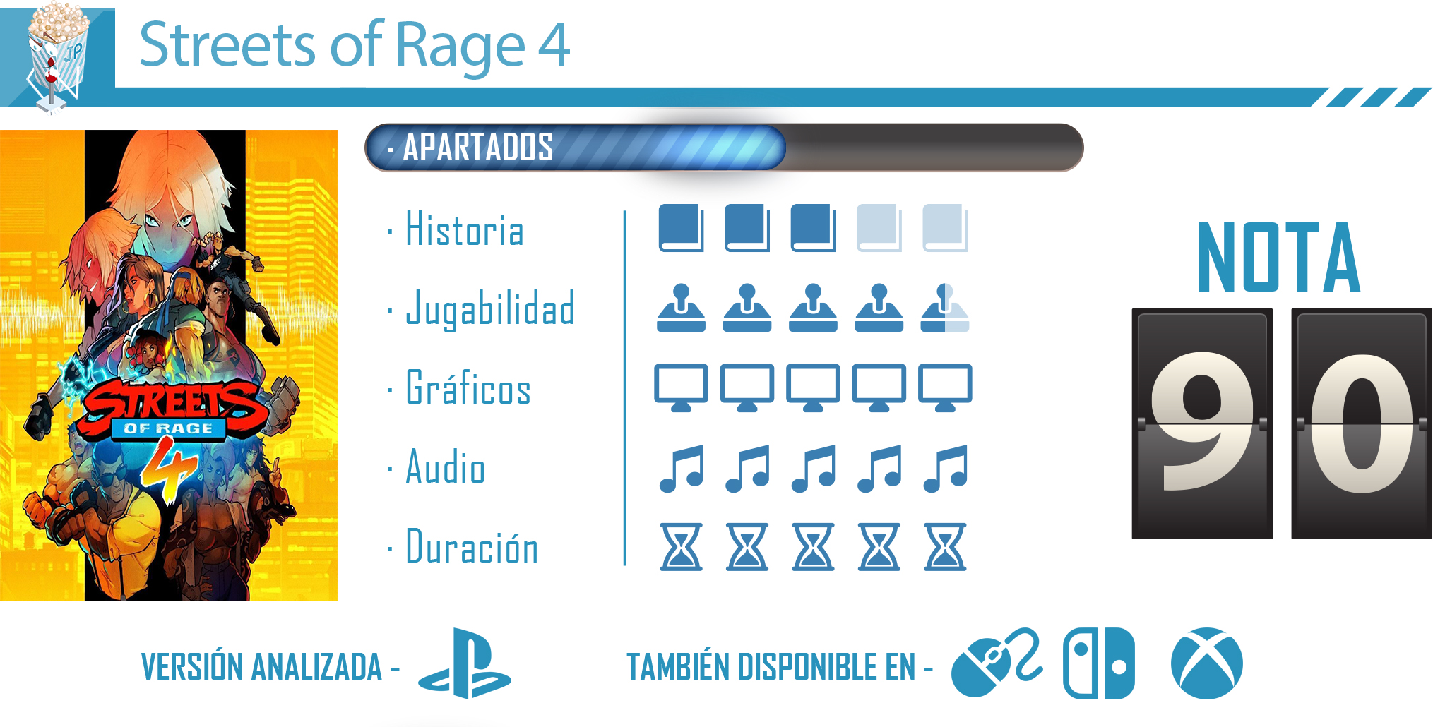 Sin duda todos aquellos que tuvieran miedo de que la saga perdiera su esencia con las nuevas generaciones pueden estar tranquilos. Lizardcube y Dotemu se van postulando poco a poco como los rescatadores de franquicias que ya estaban algo olvidadas y son capaces de llevarlas a los sistemas actuales, manteniendo toda las sensaciones originales. Con Streets of Rage 4 nos traen juego sobresaliente, lleno de acción y con un apartado artístico y sonoro realmente sublime, y con una jugabilidad realmente adictiva que nos tendrá enganchados durante horas y horas, rememorando nuestra juventud o construyendo nuevos recuerdos en aquellos que se acerquen a la saga por primera vez.
