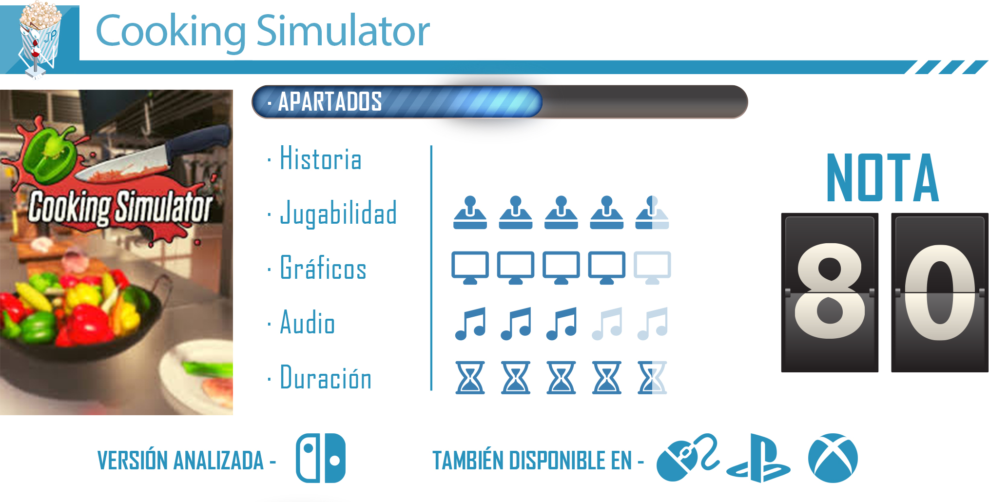 Hoy os traemos uno de los últimos juegos del estudio polaco Big Cheese Studio: Cooking Simulator, que salió para PC y recientemente ha dado el paso a Nintendo Switch. Nuestro objetivo será dar a conocer nuestro restaurante, conseguir fama y que vuelva a ascender entre los mejores.