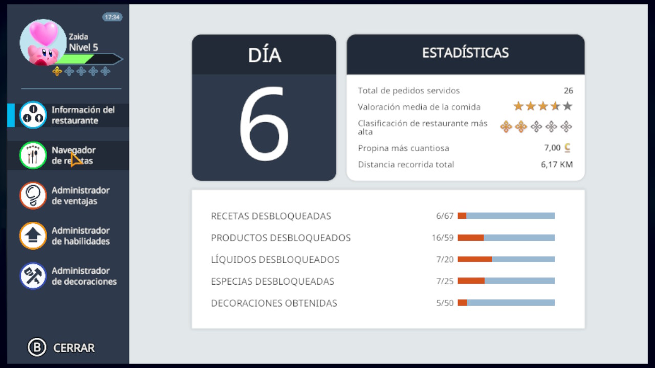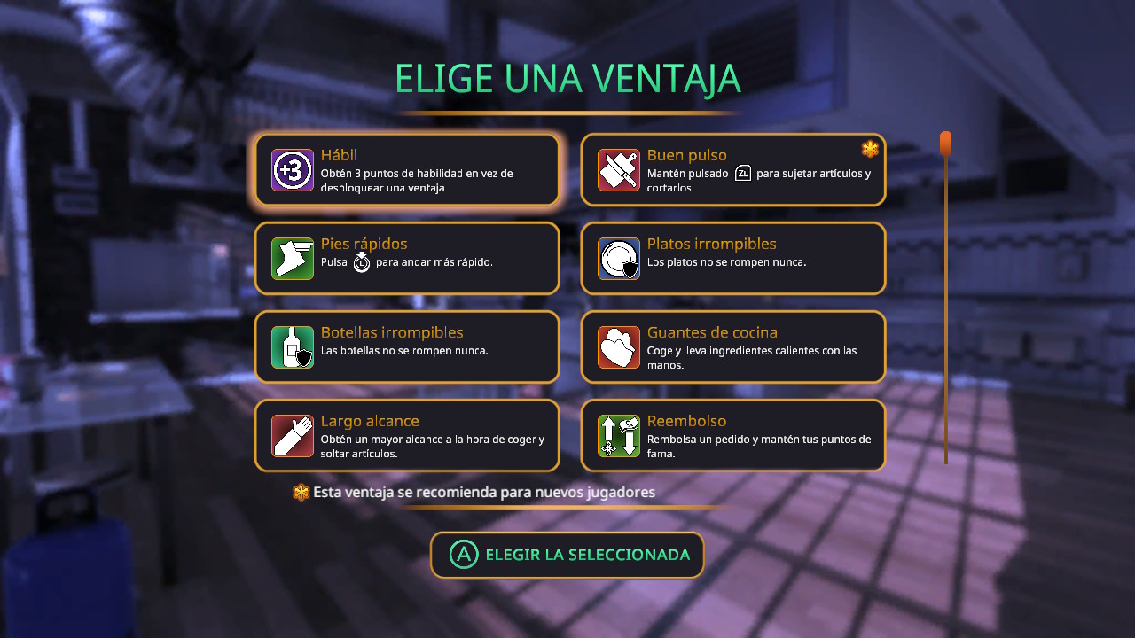Una vez terminado el día, nos suman la experiencia, y si hemos subido de nivel de habilidad podremos elegir nuevas o mejorar habilidades con los PH obtenidos, como productos y utensilios más baratos, y también podremos elegir ventajas como guantes, pies rápidos, etc. Aquí te recomiendo que cuando puedas obtengas contactos, es bastante importante porque te permite pasar al siguiente nivel de fama con una puntuación total del crítico de 3’5. Por último, también podremos desbloquear nuevas recetas.