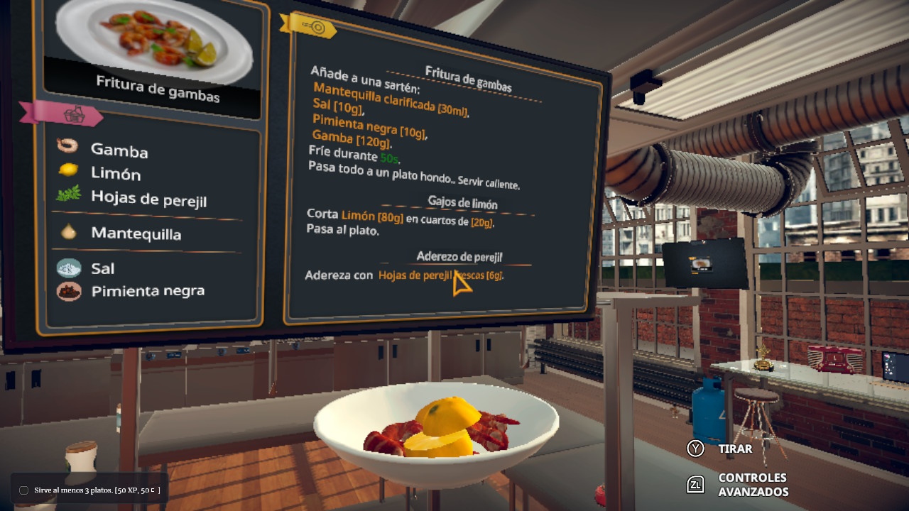 Además de la jugabilidad, un punto fuerte de Cooking Simulator es la calidad de los gráficos, bastante buena, ya que contamos con una cocina realista y muy detallada, no sólo en equipamiento, también a nivel de ingredientes y demás productos y utensilios. La única pena es que a mí no me quedaban los platos tan bien presentados como en el recetario y en el traíler, pero bueno, es lo que tiene el realismo.