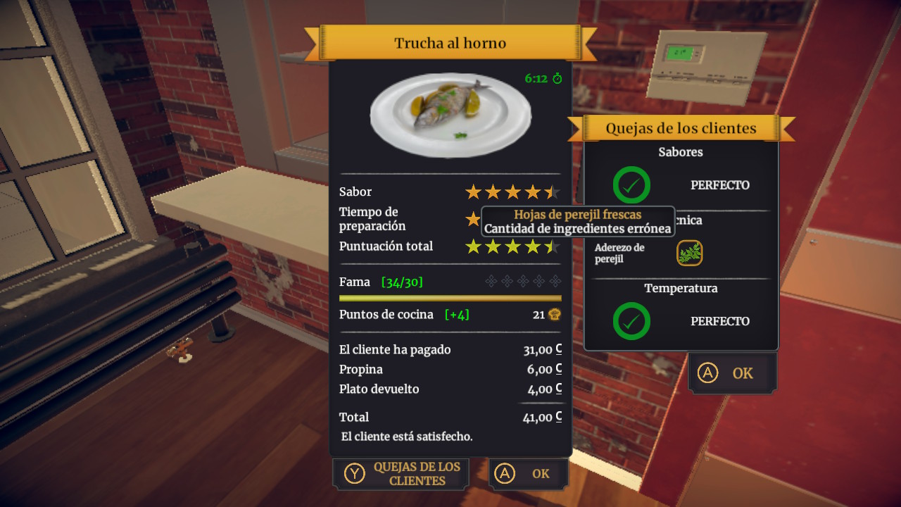 Al entregar el pedido el cliente lo valorará por sabor y tiempo de preparación, y eso nos dará la puntuación total. Dependiendo de esta puntuación, nos darán puntos de fama y de cocina, o incluso si lo haces muy mal puedes perderlos.