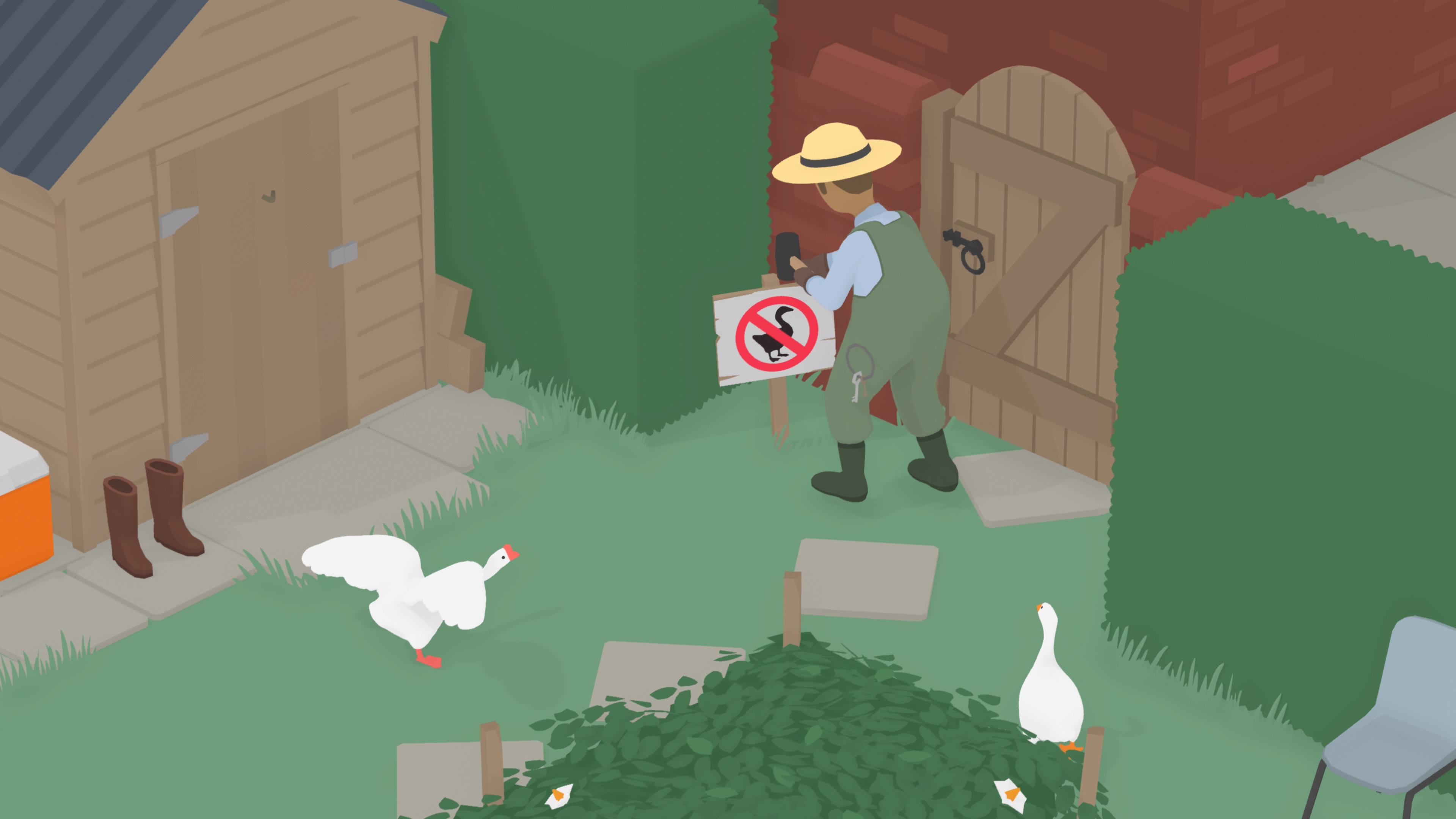 Artísticamente Untitled Goose Game es una maravilla, no por tener unos gráficos a la última, sino por el buen gusto con el que está diseñado. El mundo habitado por este endiablado ganso esta creado con una exquisita sencillez casi minimalista dominada por tonalidades pastel y unas texturas planas, casi sin relieve. Es aquí donde se introducen una serie de escenarios variados dominados por unos lugareños con facciones desdibujadas que podían pertenecer a cualquier pueblecito rural y que son representativos precisamente de ese ambiente: tenemos a un jardinero, niños, vendedoras o incluso a personas adineradas.