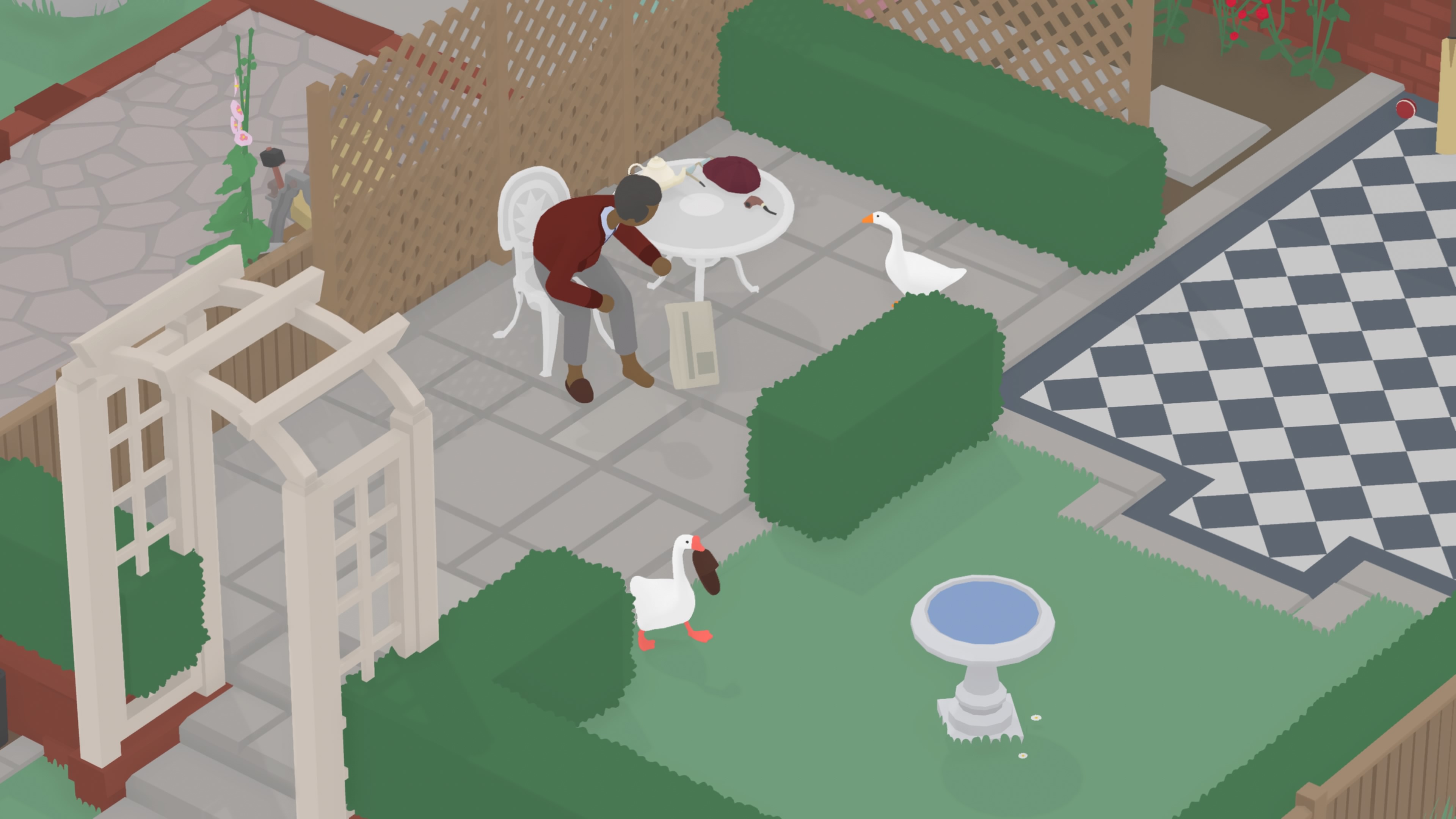 Pero lo interesante de Untitled Goose Game es cómo ingeniárnoslas para realizar esas tareas haciendo uso del propio escenario y de los elementos que allí se encuentran. No hay una única forma de completar una tarea, sino que podremos usar todo lo que este en nuestra mano para completarlas. Pero siempre hemos de tener un ojo puesto en los lugareños, pues si bien no nos atacarán, estos buscarán continuamente interrumpir y entorpecer nuestras acciones, arrebatándonos los objetos que llevemos en nuestro pico, recuperándolos del lugar en el que nosotros los hemos depositado o asustándonos con diversos utensilios para que huyamos despavoridos. Aquí entra en juego un factor de “infiltración”, y es que en algunos momentos deberemos movernos con mucha cautela para evitar que nos detecten.