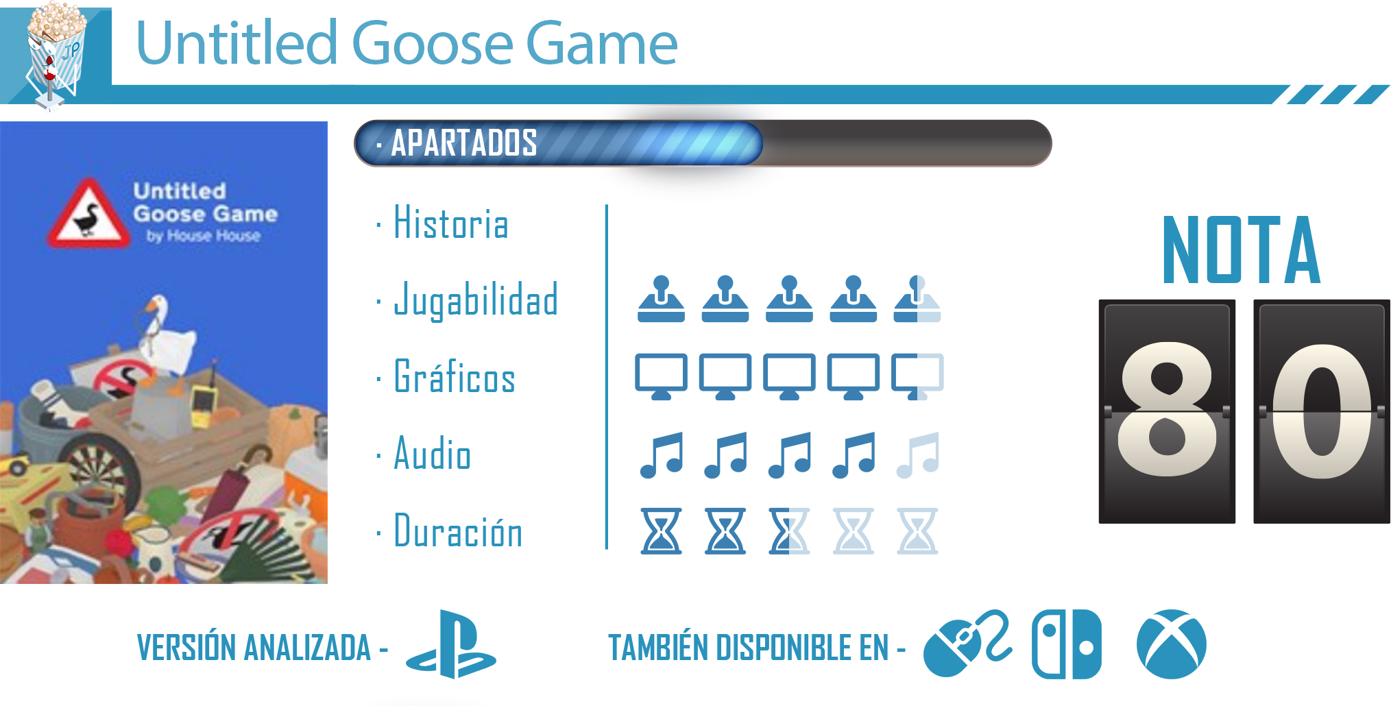 Si os gustan los juegos extravagantes, extraños y originales no podéis pasar por alto Untitled Goose Game. La obra de House House es única en su género; un divertido juego que por su innovadora fórmula nos mantendrá enganchados pese a su corta duración. Es sin lugar a dudas uno de los indies que todo jugador ha de probar, y más en esta ocasión, pues con la incursión de su modo cooperativo se vuelve incluso aún más divertidos, dándonos grandes y alocados momentos.
