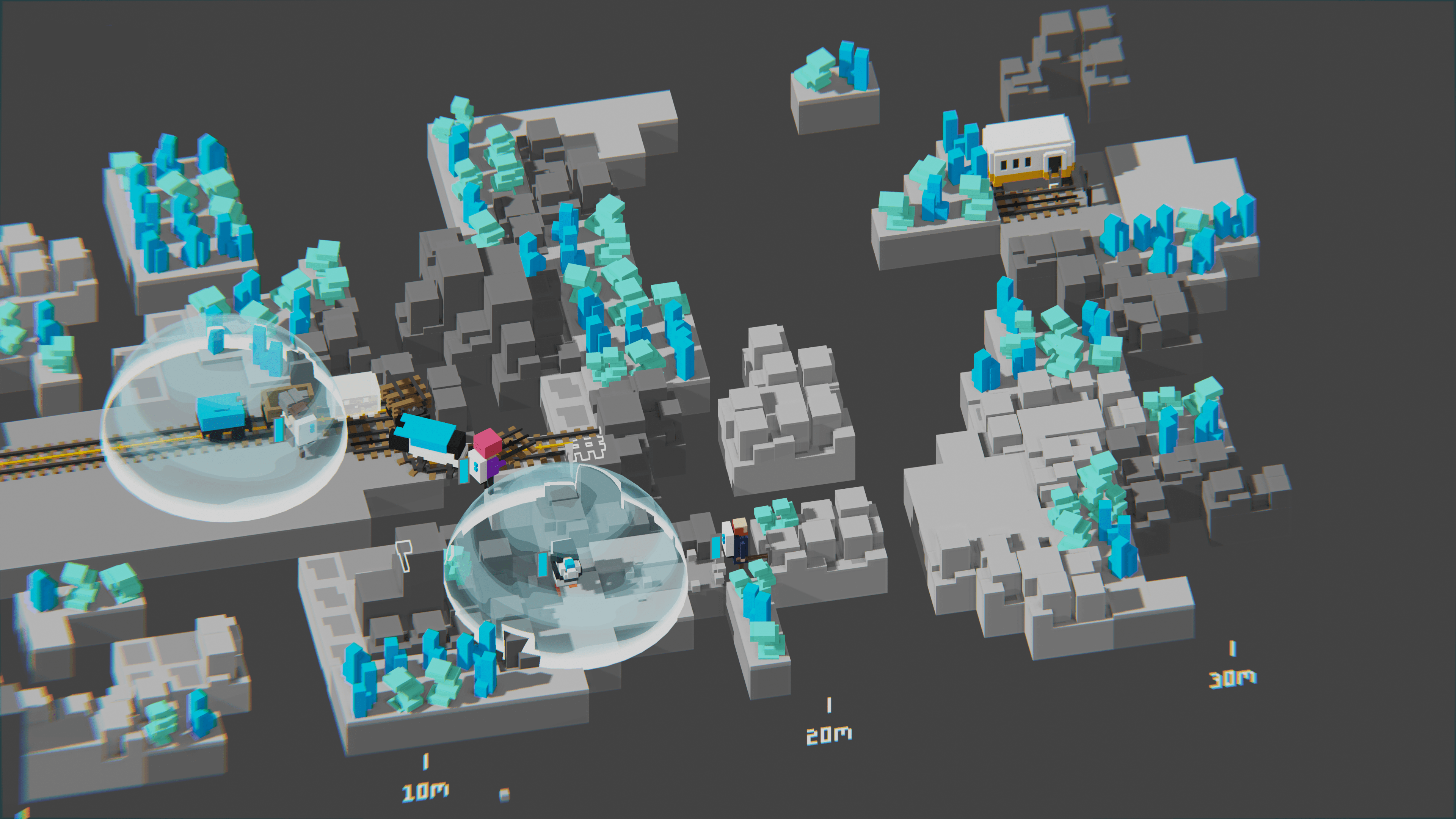 Estéticamente Unrailed! es un juego sencillo, basado en cubos y en las físicas de estos, y cuyo resultado puede recordarnos ligeramente a otros títulos como Minecraft. Los escenarios que conforman el mapa de juego se disponen a partir de pequeñas formas geométricas unidas para formar las diferentes estructuras. Estos escenarios son, en definitiva, una especie de rectángulo alargado donde tendremos que ir avanzando y donde se disponen todos los elementos de juego.