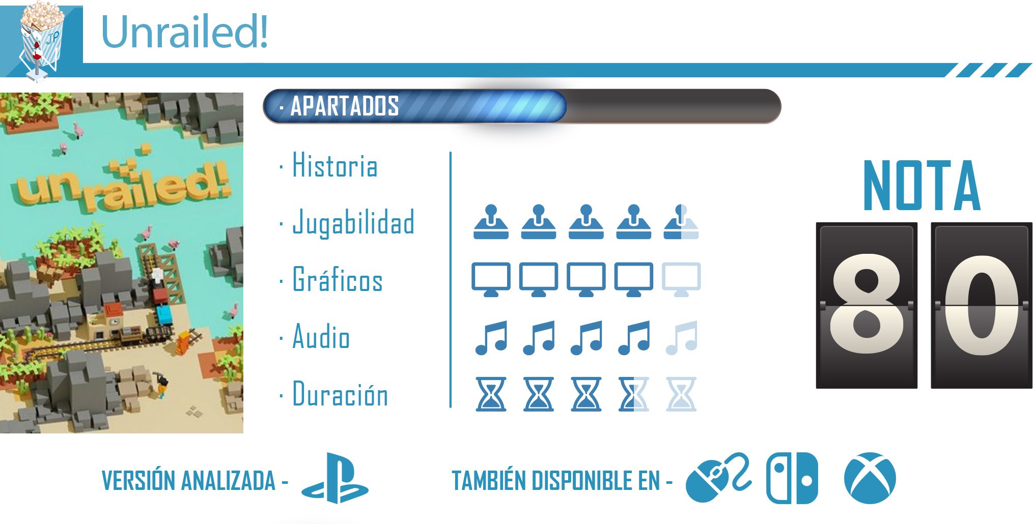 Unrailed! es un juego simpático y divertido, especialmente si se juega con amigos. Bastante desafiante si nos ponemos el reto de avanzar todo lo que podamos. Aunque es una lástima que la experiencia para un jugador sea un poco descafeinada, se nota que es un juego enfocado para jugar junto a otros jugadores y es allí donde despliega todas sus herramienta que lo conforman como un título muy divertido.
