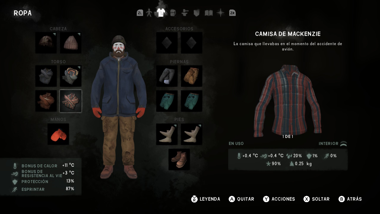 La ropa que llevemos encima será un factor importante a la hora de protegernos del frío. Tenemos diversas prendas desde camisas, chaquetones, gorros, guantes y muchos más, cada uno de ellos con unas características concretas de peso, duración, protección al frió, sensación térmica, etc. Está ropa se ira estropeando con el uso por lo que es importante tener algo con lo que repararla. También podremos confeccionar nuestro propio vestuario, algo beneficioso pues las prendas de pieles son muy eficientes, pero también muy laboriosas. A esto se le suma que la ropa puede mojarse o congelarse y en ese caso se convertirá más en un hándicap que un beneficio.