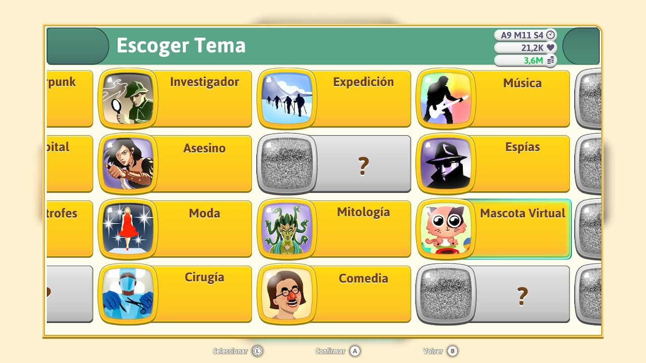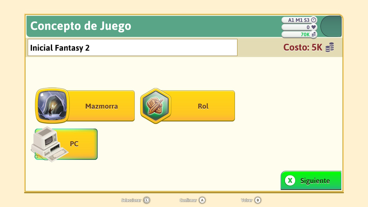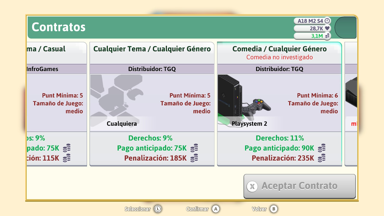 A estas opciones anteriormente mencionadas se irán añadiendo otras frutos de nuestra investigación y progreso. Como por ejemplo, podemos seleccionar entre nuevas temáticas o nuevos tipos de juego. Además se nos abrirá la posibilidad de crear videojuegos de diferentes presupuestos que van desde indies hasta triple AAA. Por su puesto también habrá la opción de lanzar títulos multiplataformas, aumentando así nuestras posibilidades de éxito, eso sí, también serán más caros de desarrollar.