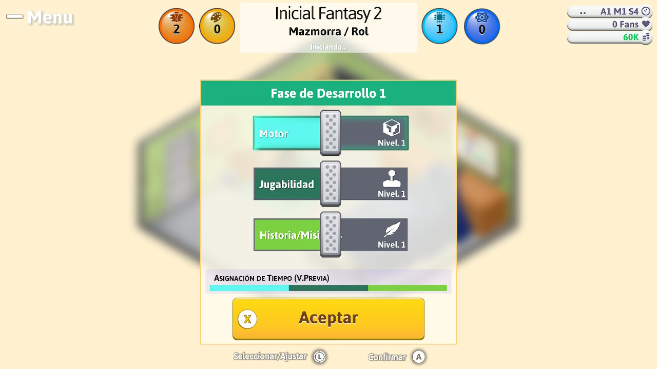 Con nuestra elección ya hecha pasaremos a ponernos manos a la obra y dará comienzo la programación de nuestro juego. El proceso es bastante sencillo, incluso intuitivo y lógico; este se presentará por medio de elecciones en tres fases de desarrollo diferentes: en la primera podremos elegir entre Motor, Jugabilidad e Historia/Misión, en la segunda entre Diálogos, Diseño de Nivel e Inteligencia Artificial, y en la tercera entre Diseño de Mundo, Gráfico y Sonido. Estas decisiones de materializarán por medio de una barra de porcentaje y deberemos dotar del tanto por ciento preciso a cada uno de ellos en función del tipo de juego que vamos a desarrollar.