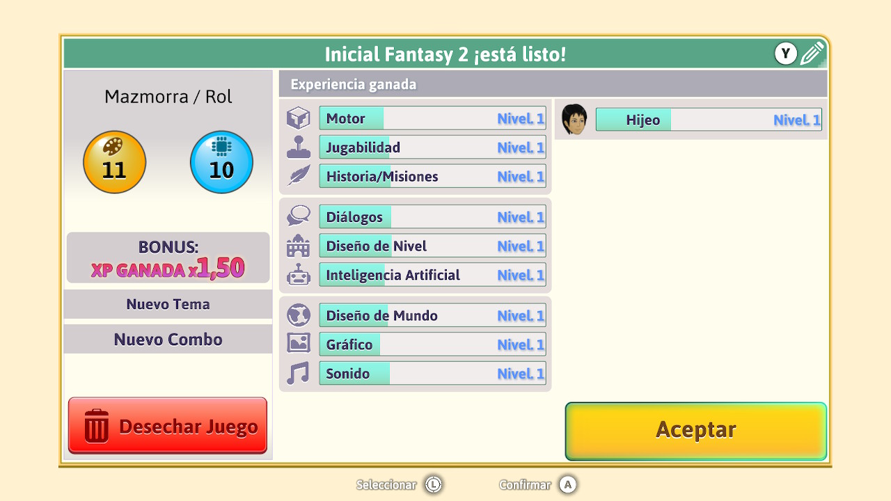 Nuestro desempeño como desarrolladores se valorará por medio de puntos de creatividad y de programación. Según nuestras elecciones nos otorgarán más o menos y al final de este proceso esto se traducirá con una serie de puntos de experiencia que nos hará ir aumentando nuestro nivel, algo que nos hará desbloquear nuevas opciones para investigar.