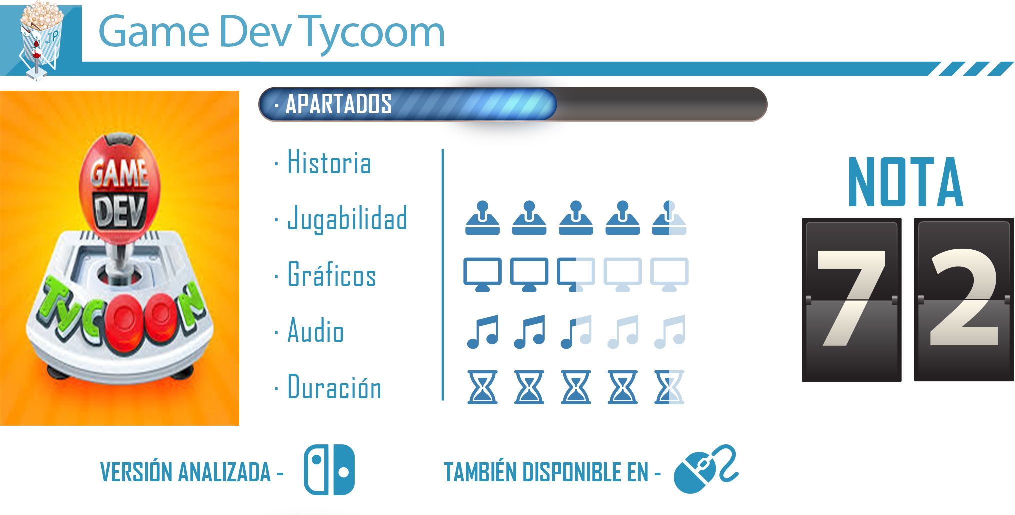 Game Dev Tycoon es un título interesante para todos aquellos que le gusten los videojuegos de gestión y los simuladores. Su propuesta era novedosa en su momento y aún a día de hoy sigue siendo lo suficientemente atractiva para todos los que buscan un título ligero para esos momentos muertos. Pero no es solo para esos jugadores y jugadoras, realmente el juego de Greenheart Games es mucho más profundo de lo que pueda parecer; la gran cantidad de contenido y acciones hará que queramos explorar cada uno de sus rincones para conseguir lograr crear el mejor videojuego de la historia. Por su puesto, es de agradecer que el estudio no solo se haya limitado a lanzar un port de su juego del año 2013; su actualización para la híbrida de Nintendo presenta una mejora gráfica sustancial, y además se han actualizado los sistemas de juego hasta la actualidad, algo que se agradece, pues no solo alarga su campaña, sino que también actualiza la historia de este mercado hasta nuestros días.