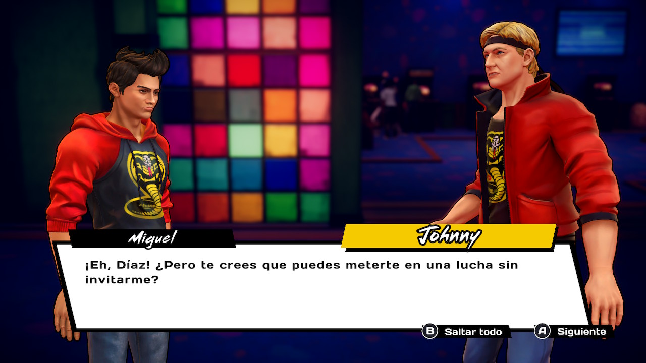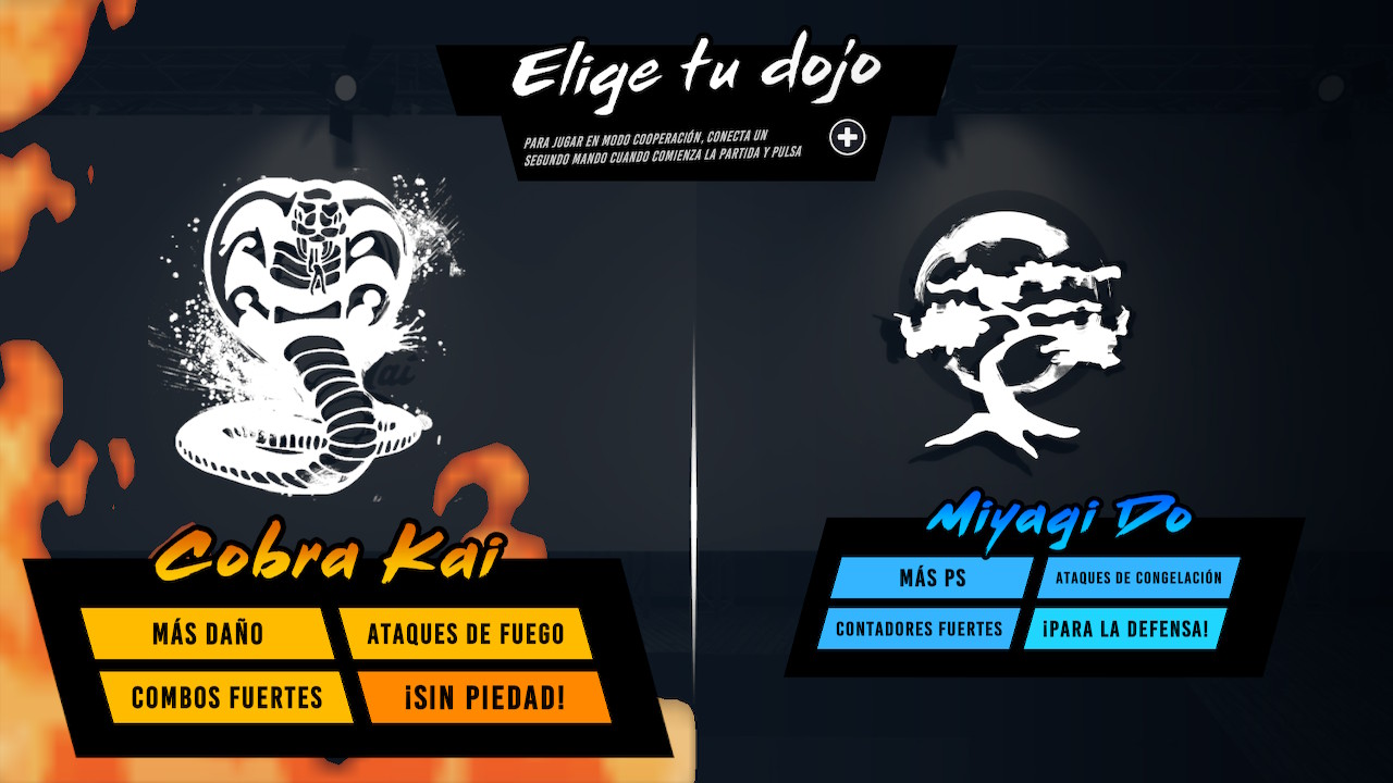 Nada más comenzar el juego tendremos la oportunidad de elegir entre los dos dojos que conforman esta historia: Cobra Kai o Miyagi Do. Cada uno contará con sus propios personajes y con un argumento inédito que se irá contando a través de una serie de viñetas de cómics bastante bien resueltas. Del lado de los Cobra Kai estarán presentes Miguel, Johnny Lawrence, Tory y Hawk, mientras que los que representarán al Miyagi Do serán Daniel LaRusso, Robby, Sam y Dimitri. Ocho personajes en total que todos los que hayan visto la serie conocerán de sobra.