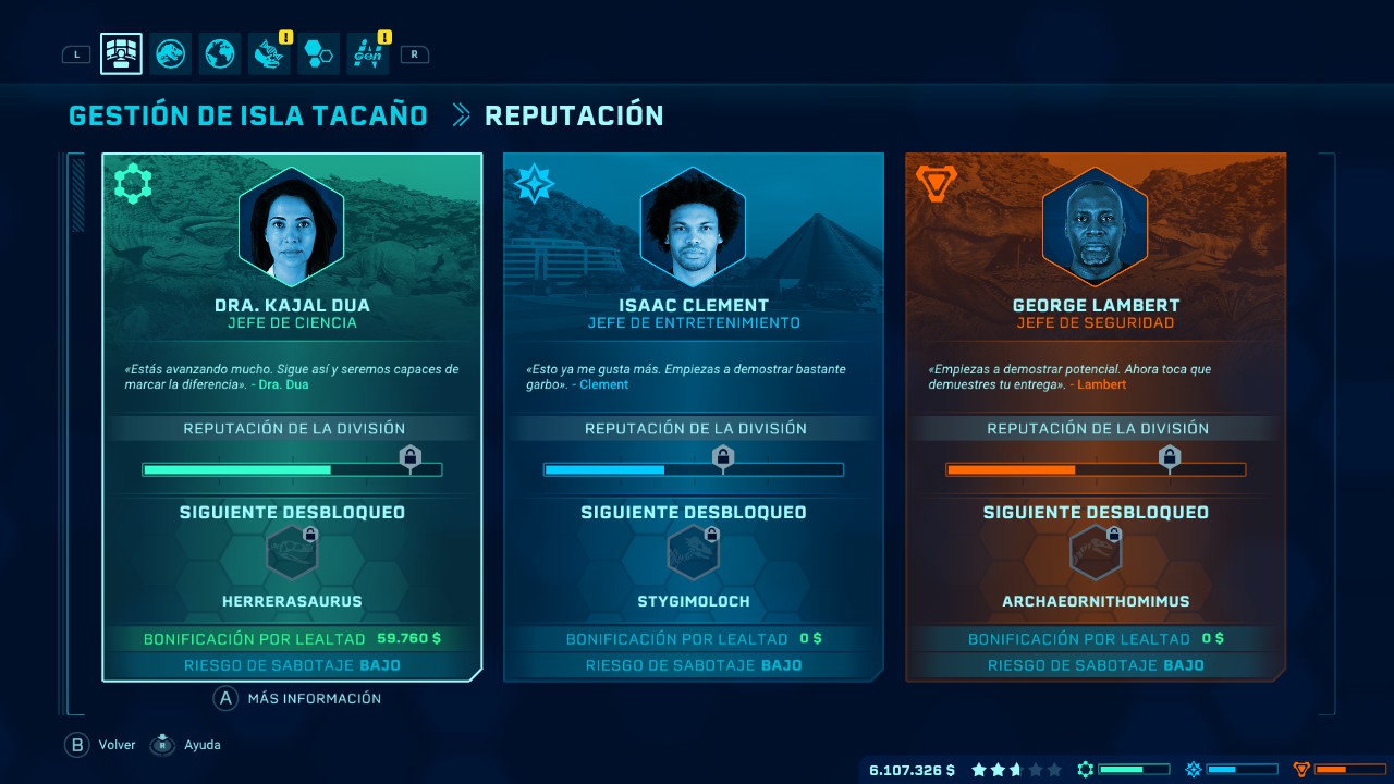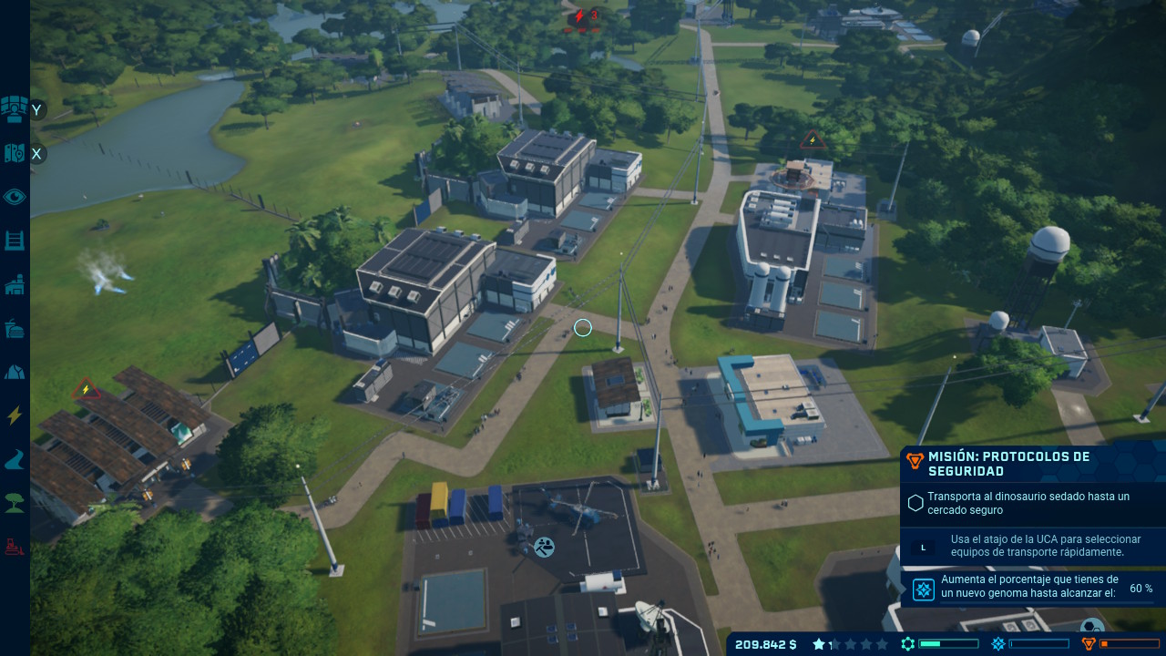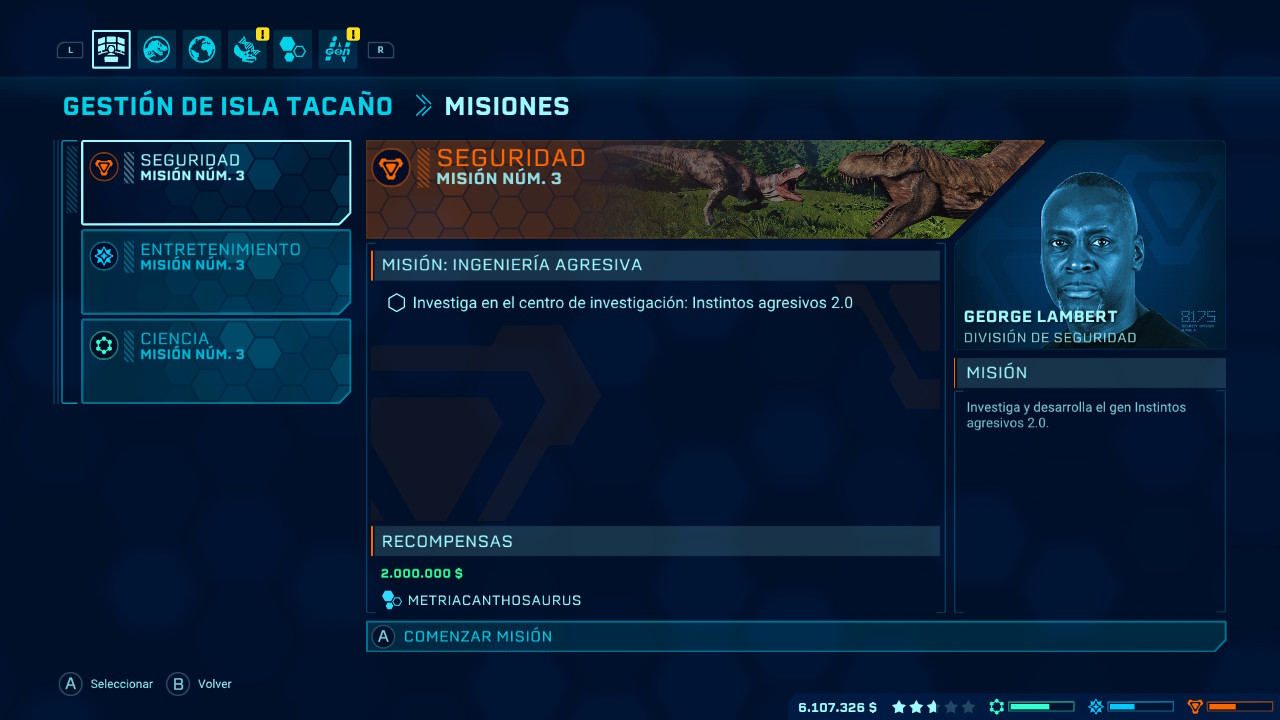 En cuanto a estas misiones hemos de señalar que se encuentran de dos tipos, por un lado están las principales y por otro lado las secundarias. Pero empecemos hablando de las principales.. Una vez estemos en la isla correspondiente veremos que a nuestra disposición se encuentran tres departamentos diferentes (ingeniería, entretenimiento y seguridad) que nos encargarán realizar una serie de tareas, al completar con éxito cada una de ellas la barra de progreso de cada departamento irá avanzando y con ello se activará la misión principal. Estas misiones principales son el verdadero reto de Jurassic World Evolution y algunas nos llevarán hasta el límite, son bastantes variadas y puede que algunas de ellas tengan más de una fase. El número de misiones principales de cada isla suele ser tres y tendremos que completarlas si o si en el caso de que queramos desbloquear una nueva isla, pero también nos servirán para desbloquear nuevas construcciones y opciones.