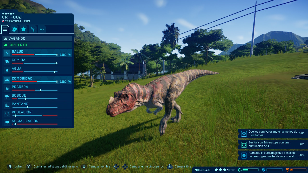 Hemos de decir que el sistema de gestión de estos seres nos parece realmente acertado y requerirán de un gran esfuerzo por nuestra parte, siempre que queramos evitar desgracias claro está. Cada especie de dinosaurios tendrá una serie de parámetros que han de ser satisfechos por nuestra parte y que van desde la propia aclimatación del lugar en la cual estén confinados (como las partes de bosque, pradera o agua), el número total de dinosaurios con el que pueden convivir y también el grupo de su especie que necesitan para socializar, y por supuesto tenerlos bien alimentados. Si alguno de estos factores no cumple los estándares requeridos por estos animales su comodidad irá bajando y una vez que se encuentre en números rojos comenzarán a arremeter contra los cercados y podrán escaparse, ocasionando así graves daños tanto estructurales como humanos.