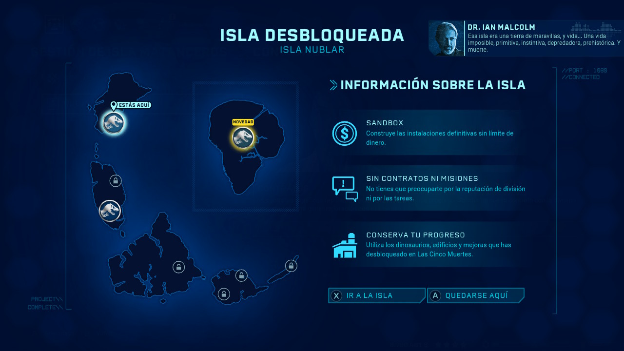 Por supuesto tenemos que hablar pormenorizadamente de las islas. Estas serán nuestras herramientas de trabajo y aquí es donde se nos presentará otro de los retos en Jurassic World Evolution ya que cada una de ellas no solo tendrá unas características climáticas únicas, sino también un terreno predefinido que puede resultarnos un obstáculo a la hora de construir. Por este último motivo debemos ser especialmente cuidadosos, planificar el futuro desarrollo y expansión de nuestro parque y optimizar al máximo el terreno ya que aunque al principio puede parecernos mucho enseguida se comenzará a llenar.
