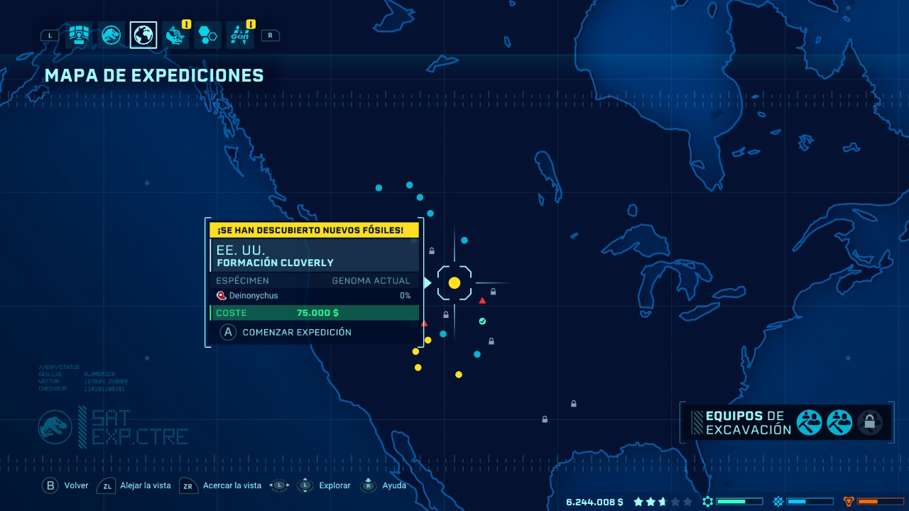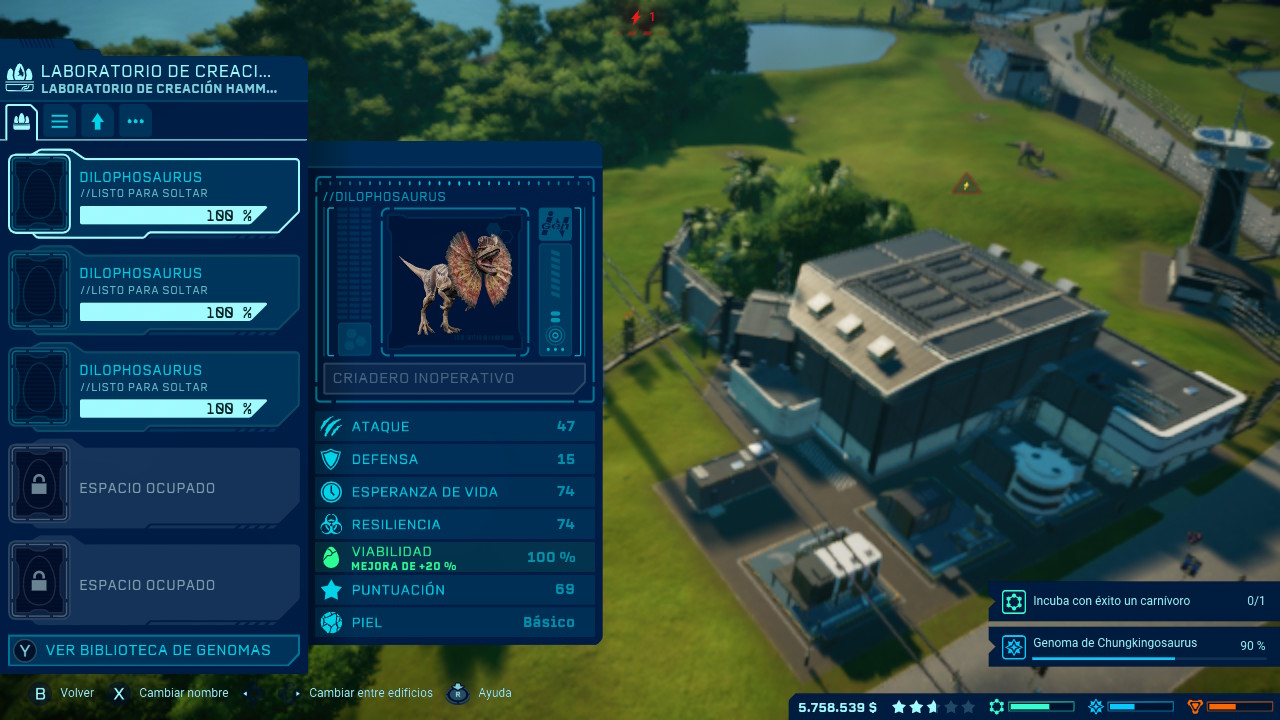 Pero claro, para ganar hay que invertir y aquí la mejor inversión son los dinosaurios porque de eso va este parque. Estos seres no estarán disponibles desde el principio, al comienzo de nuestra aventura los laboratorios tendrán una muy limitada gama de especímenes que podremos crear por lo que deberemos enviar expediciones a diferentes asentamientos para que descubran nuevos fósiles, sin embargo con esto no será suficiente ya que deberemos extraer el ADN de estos fósiles para clonarlos. Aunque la cosa se complica un poco más al añadir el porcentaje de éxito en la creación de estos dinosaurios. En primer lugar hemos de decir que si no tenemos al menos el 50% del ADN de una especie no será posible su creación y aun así puede llegar a fallar aunque tengamos más por lo que la solución más práctica será mandar más expediciones a estos lugares para obtener más ADN y así aumentar el porcentaje. Lógicamente toda esta operación tiene un precio, y no es barato, pero en ocasiones nuestras expediciones no traerán únicamente fósiles de dinosaurios sino otros materiales que pueden venderse por un alto precio para así poder continuar con nuestras inversiones.