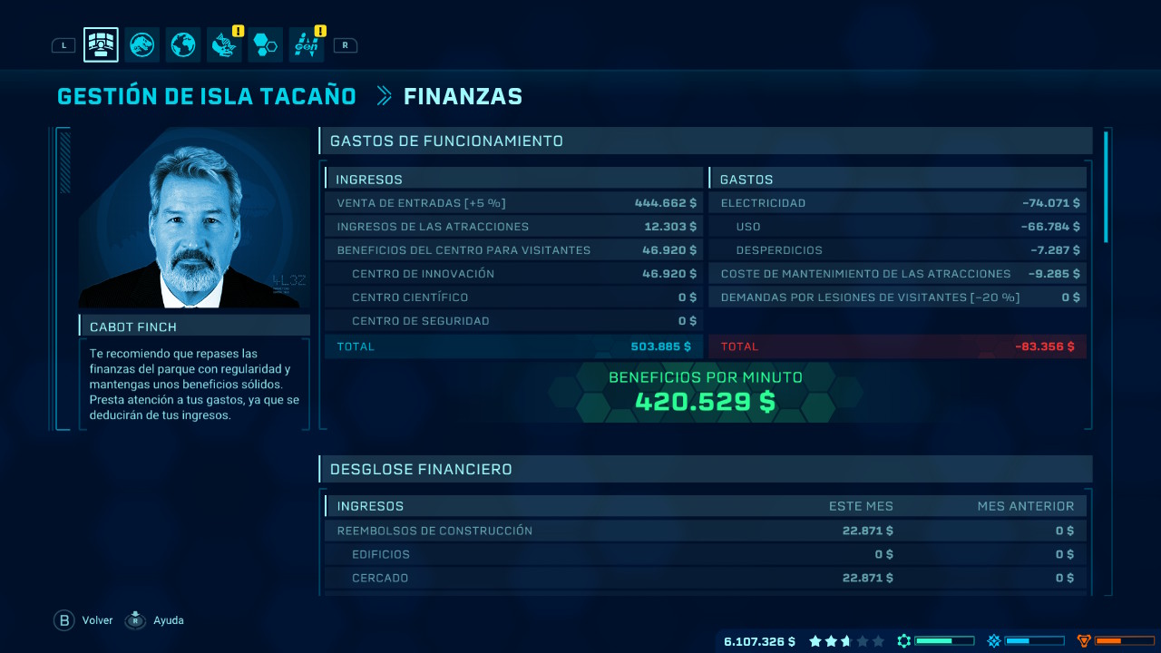 Completar misiones será fundamental y una de las principales fuentes de dinero, sobre todo al comienzo de nuestra intervención en cada una de las islas ya que no habrá suficientes visitantes para obtener beneficio. Aquí es donde vemos la importancia económica en Jurassic World Evolution, todo cuesta dinero y no precisamente poco por lo que deberemos tener cuidado a la hora de gastar y pensar en que invertir para que de esta manera nos genere el mayor beneficio posible. Este factor de gestión más económico del juego será una carrera a contrarreloj en los primeros momentos ya que es posible que al principio se generen más perdidas que beneficios y si nos quedamos sin dinero para invertir en nuestro parque no tendremos nada que hacer, a menos que podamos vender algo para sanear nuestras cuentas. No obstante esta dificultad, como ya hemos indicado, se presentará en mayor medida en los primeros momentos que pasemos en cada isla ya que una vez que vayamos abasteciendo a nuestro parque de dinosaurios y de tiendas llegará un punto que el dinero entrará a espuertas y no tendremos que preocuparnos por él.