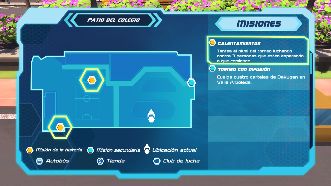 Fuera de los combates encontramos un sistema de misiones que será lo que nos haga avanzar en la aventura. Las misiones principales serán las obligatorias para desbloquear nuevos detalles de la trama y continuar hacia el final de la aventura. Pero también tendremos una serie de misiones secundarias que podremos realizar para obtener alguna recompensa. Lamentablemente la variedad de estas no es demasiada y consistirá fundamentalmente en realizar algún tipo de recado para alguien o en combatir contra una persona determinada. No obstante, como hemos indicado, al realizarla podemos obtener diversos beneficios como experiencia para nuestros Bakugan, nuevas cartas de ataque, complementos cosméticos para nuestro avatar, etc.
