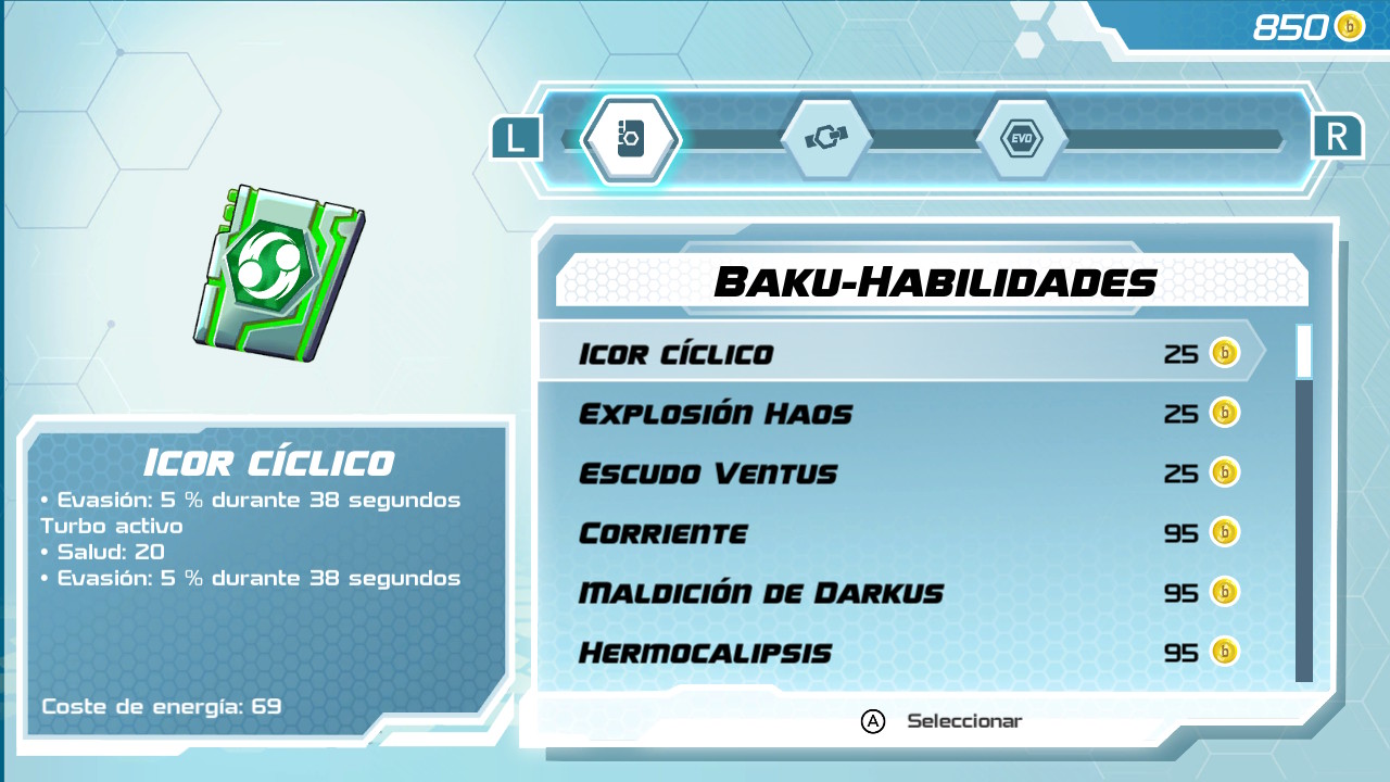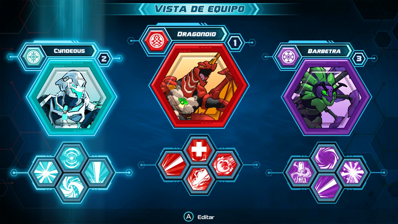 Al acabar el enfrentamiento seremos recompensados con una serie de puntos de experiencia con los que nuestros Bakugan podrán subir de nivel y aumentar con ello sus estadísticas. Por supuesto también podrán aprender nuevos ataques, pero no solo los adquirirán de forma orgánica, al aumentar su nivel, sino también obtendremos una serie de cartas que podremos equiparles, ya sea de recompensa por alguna misión o comprándolas en algunas de las tiendas del juego. Solo podremos llevar equipadas cuatro de estas cartas que nos darán acceso a los ataques en cuestión de las mismas, y si queremos cambiarlas por otras bastará con sustituirlas.