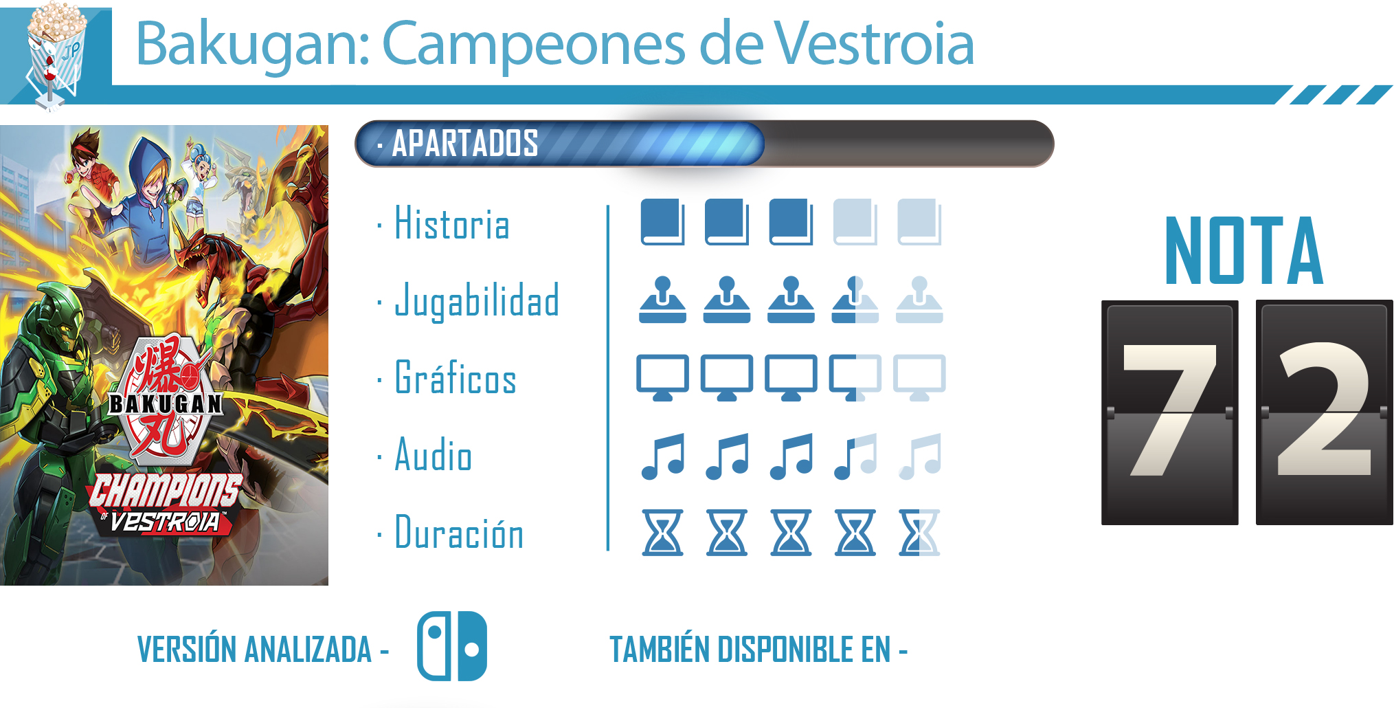 Bakugan: Campeones de Vestroia es un juego que sabe a quien va dirigido, a todos esos fans de la serie y de la franquicia que buscan una nueva experiencia digital en la que coleccionar y entrenar a sus propios monstruos colosales. Tomando una base de RPG, el videojuego de WayForward se desenvuelve bastante bien en lo referente a sus mecánicas de exploración y de combate, pero se echa en falta otros elementos como una historia más profunda o una mayor variedad de Bakugan disponibles para incorporarlos a nuestras filas. No obstante es un juego que se hará entretenido, sobre todo para los más pequeños de la saga y para los seguidores de la serie.