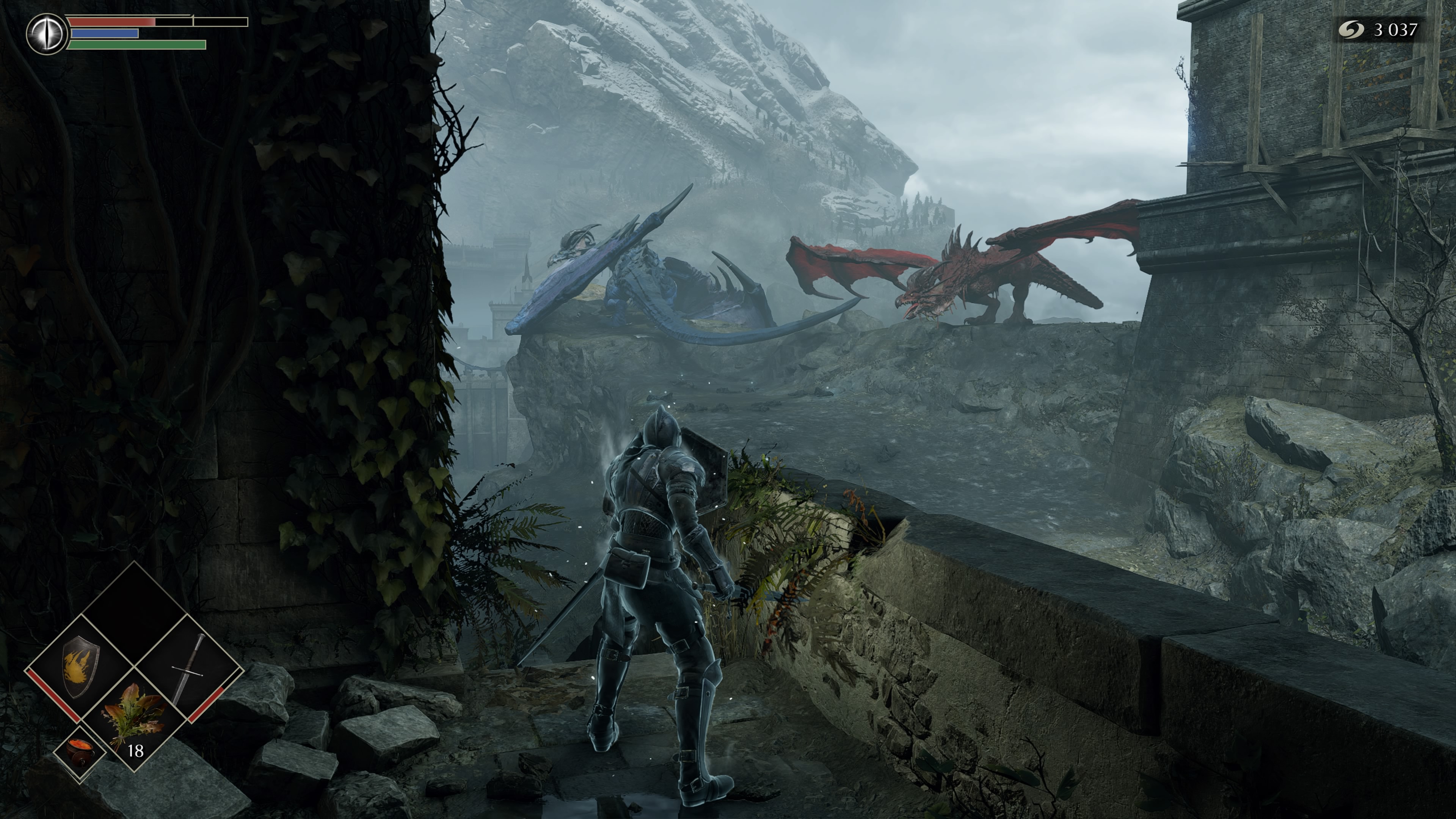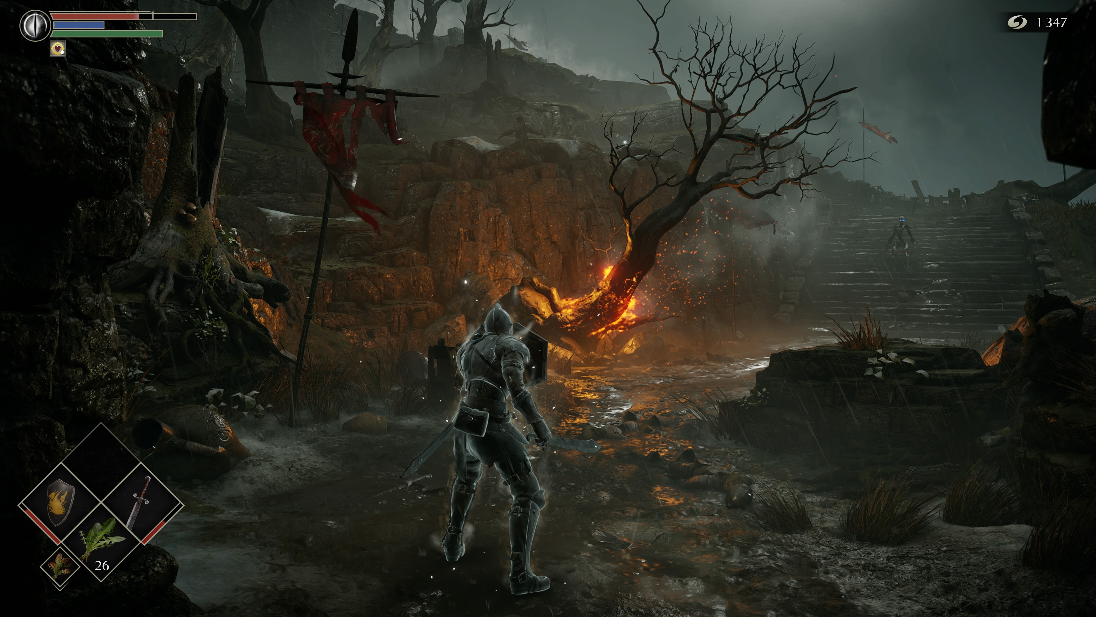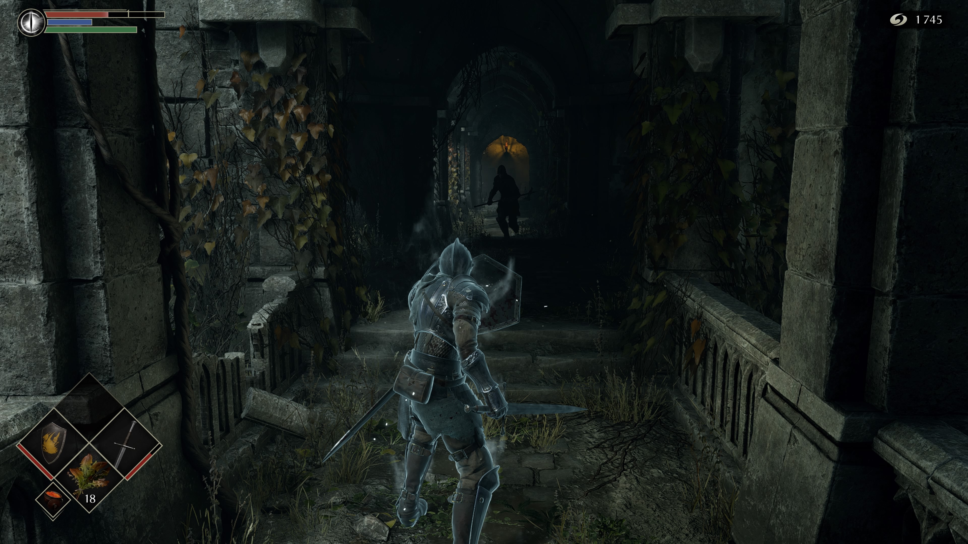 Pero entrando ya en el juego en sí, vemos como, en definitiva, tenemos las mismas formas de jugar. A nuestra disposición tendremos diferentes formas de atacar, con golpes más rápidos y menos contundentes, o más fuertes pero más lentos. Además, también tendremos dos formas de hacer frente a los ataques de los enemigos, como son rodar para esquivar sus envestidas, o protegernos con nuestro escudo. Por supuesto podremos combinar diferentes acciones, como por ejemplo, si bloqueamos con nuestro escudo en el momento precioso desviaremos el ataque de nuestros rivales y tendremos la oportunidad de ejecutar un contraataque que le quedará bastante tocado, o también podremos rodear a nuestro rival para atacarle por la espalda, ocasionando así un gran daño y que pierda el equilibrio. No obstante, está presente el conocido sistema de estamina, que es, a fin de cuentas, un medidor de resistencia que nos limitará a la hora de realizar acciones, y es en este punto donde siempre ha radicado una de las dificultades de la saga Souls ya que deberemos adaptar nuestra forma de jugar dependiendo de la resistencia de nuestro personaje por lo que deberemos saber en qué momento nos conviene atacar, en cual esquivar o en cual defendernos, siempre para no quedarnos sin estamina porque si lo hacemos nos quedaremos expuestos y esos podría significar la muerte.