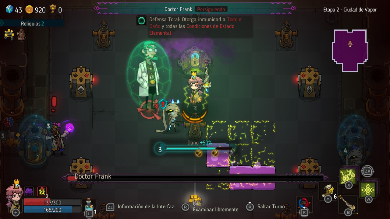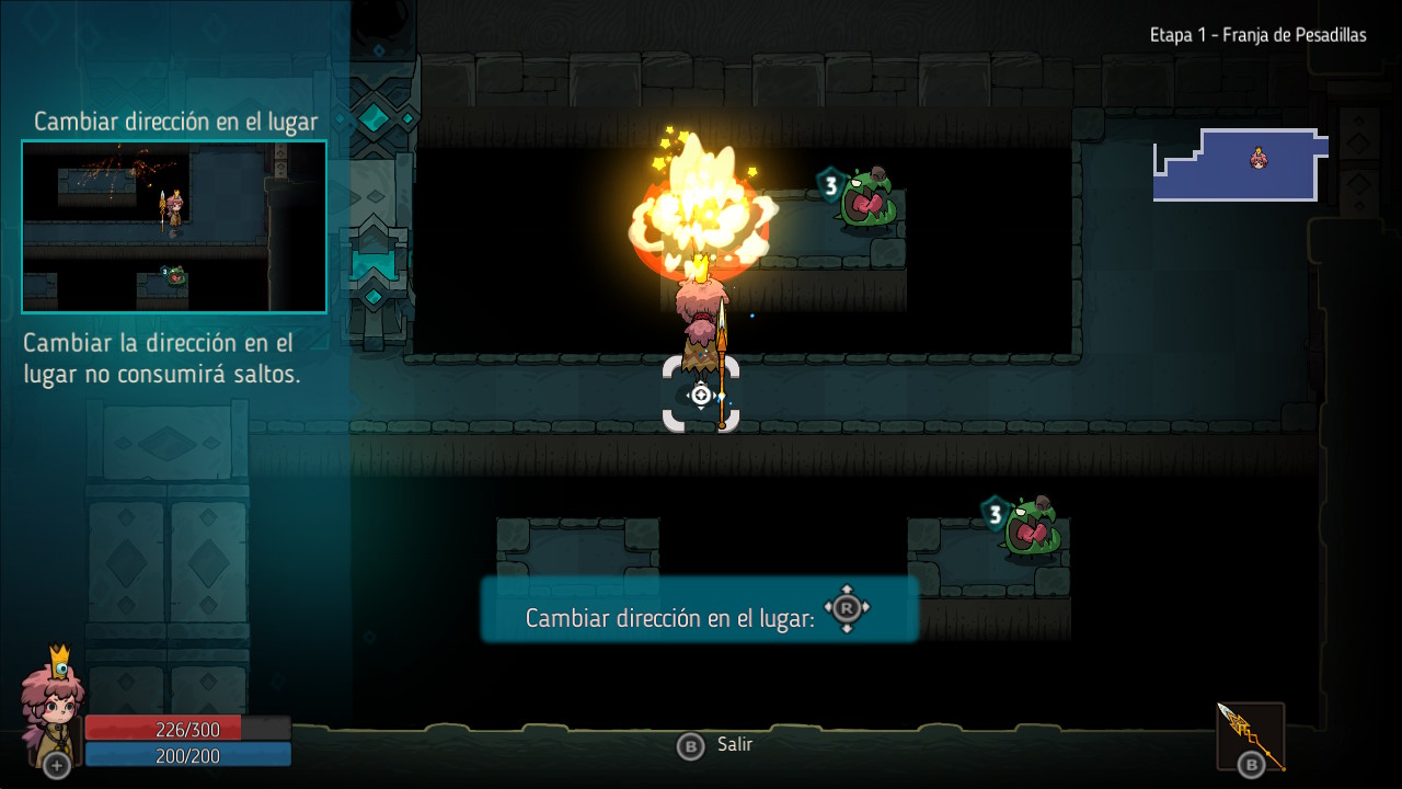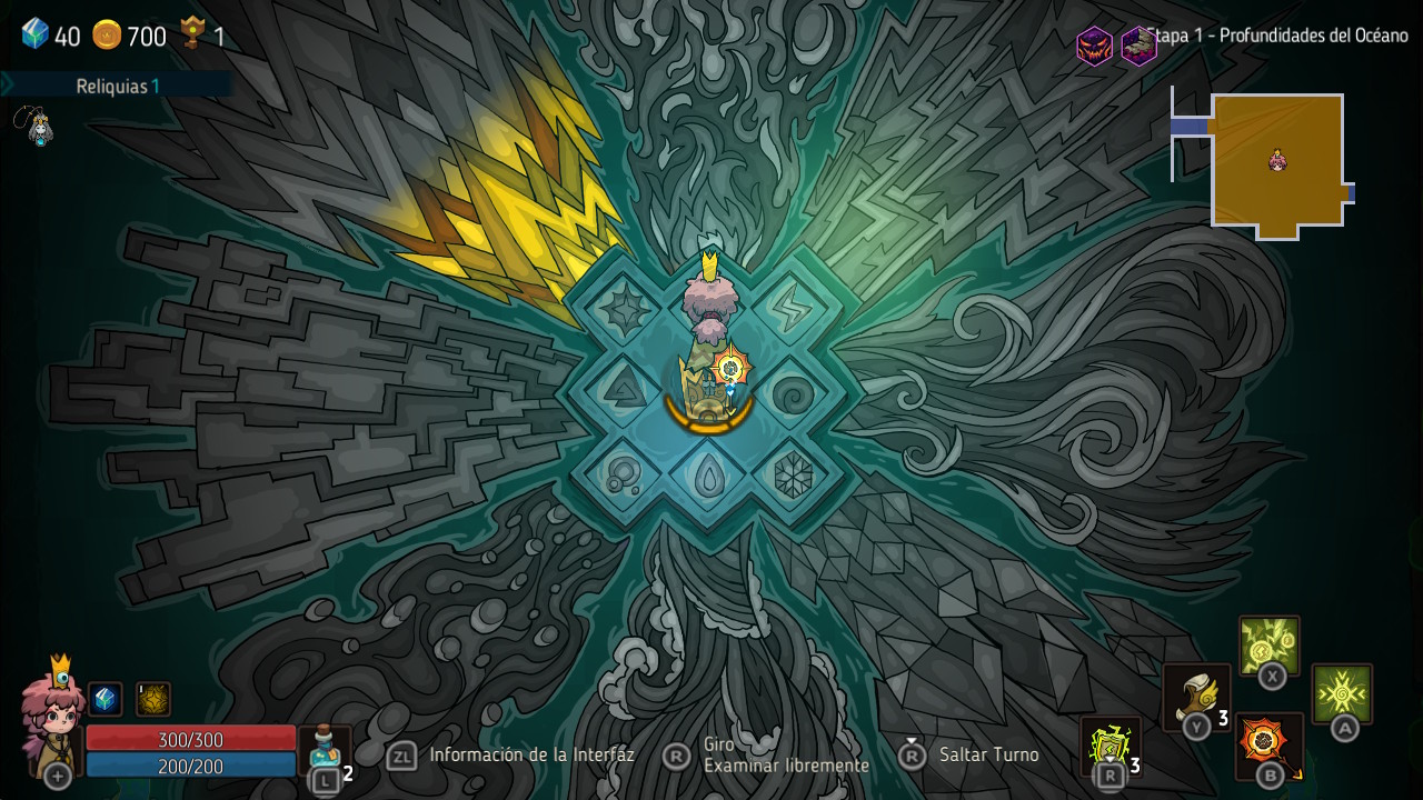 En primer lugar hablaremos del control; Elle puede moverse en horizontal y en vertical, pero solo en una casilla por turno y se desplazará como si fuera una pieza de ajedrez, y de igual manera lo harán los enemigos. Si bien es cierto que tenemos ciertas formas de desplazarnos más casillas y diferentes posiciones, como es la habilidad de transportarnos a cualquier parte del escenario que entre dentro de nuestro espacio, esto no suele ser lo habitual por lo que deberemos familiarizarnos con estos movimientos basados en turnos. A diferencia de otras, la habilidad de transportarnos no consumirá turno y nos será muy y necesaria para poder llegar hasta nuestros enemigos, esquivar ciertas trampas que encontraremos por los escenarios y, sobre todo, para salir del alcance de los ataques enemigos. Esta habilidad tiene un número limitado de usos, puede recuperarse tras provocar ruptura en los enemigos o tras completar salas, pero debemos ser conscientes de cómo usarla en cada situación.
