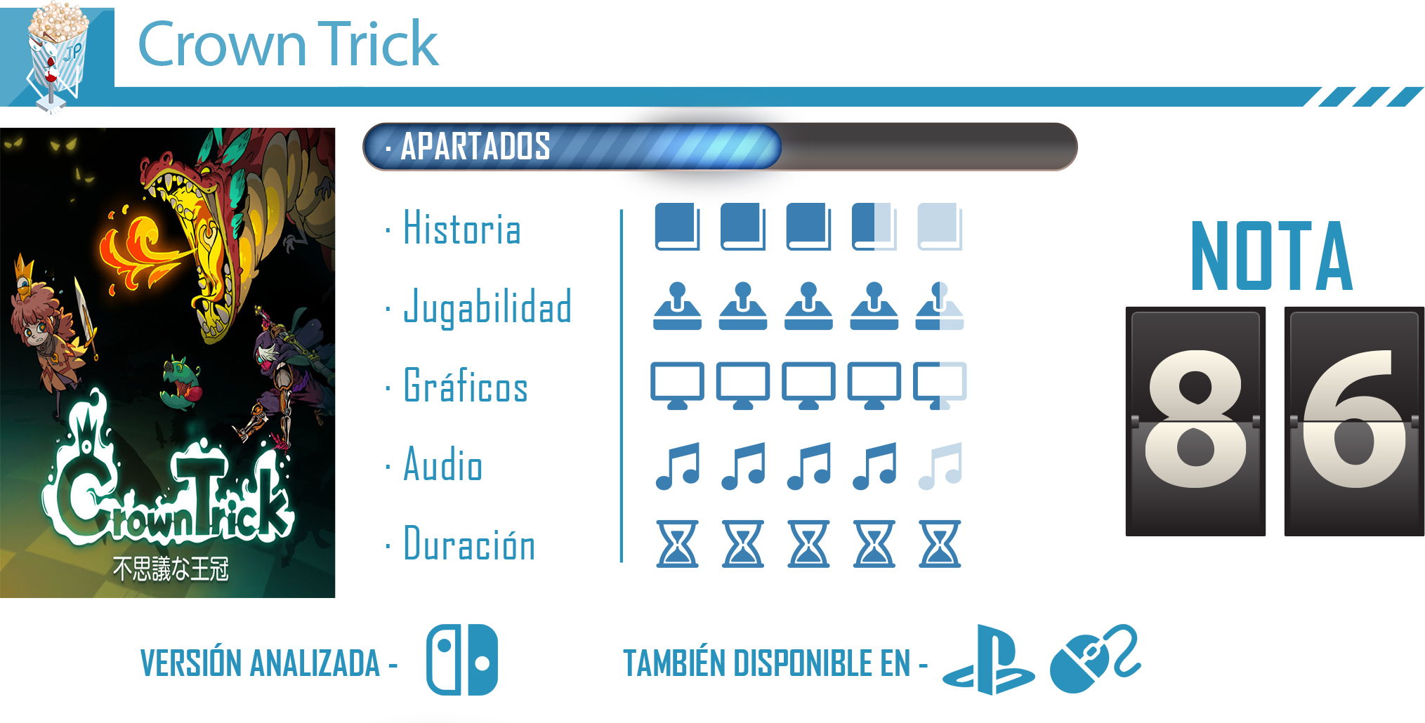 Crown Trick es un roguelike que busca diferenciarse de los demás con sus mecánicas jugables y lo hace de buena manera. Si bien es arriesgado mezclar la mecánicas y opciones de un roguelike con un juego de estrategia, Crown Trick lo logra de manera bastante eficiente, dando al jugador un título de gran duración basado en la estrategia, la calma y en el que será necesario pensar cada movimiento antes de realizarlo. Es un título que necesita de unas horas para poder comprender sus mecanismos y lo que pide del jugador, pero una vez pasada esta brecha, se convierte en un juego que apetece jugar durante horas o en ratos libres para echar una partida.