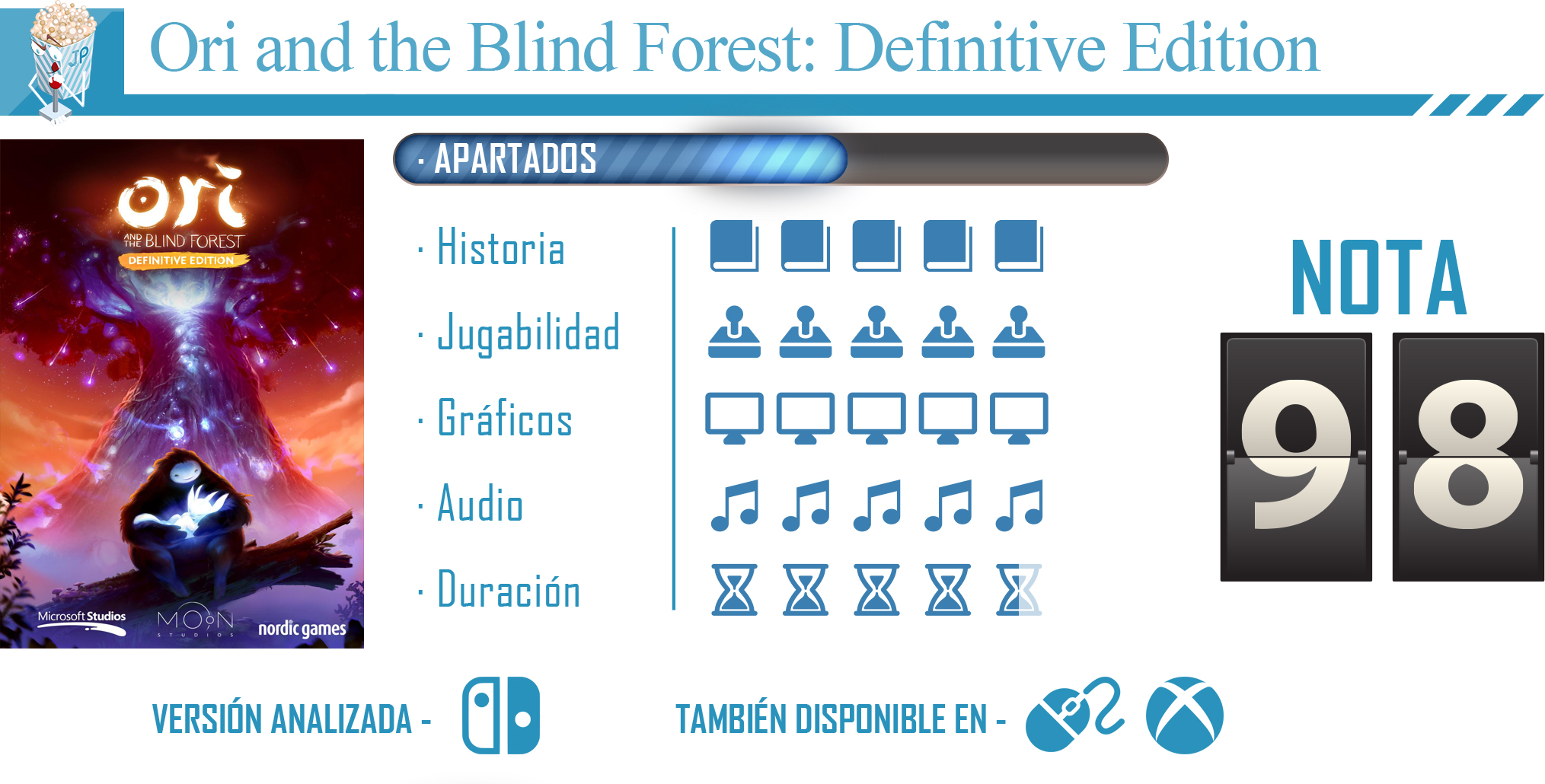 Solo podemos definir a Ori and the Blind Forest: Definitive Edition como un juego brillante. Es un imprescindible y un auténtico regalo para los poseedores de una Nintendo Switch. Es uno de esos juegos únicos que merece la pena experimentar y vivir pues la obra de Moon Studios es precisamente eso, una maravillosa experiencia jugable e inolvidable que llegará a lo más hondo de los jugadores. Su emotiva y emocional historia, su pulida jugabilidad y su excelente apartado audiovisual hace de el un título sobresaliente del que apenas se pueden poner pegas. Sin duda Ori es una obra para recordar, un videojuego de esos que hacen de este sector un verdadero arte vivo y que sin lugar a dudas recomendamos a todos los jugadores.
