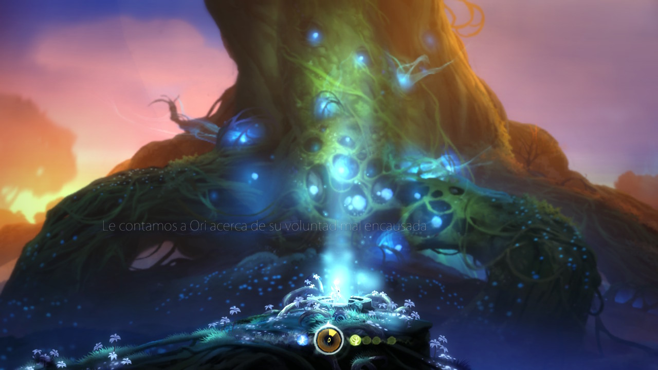Esto supondrá el inicio de su viaje, un periplo emotivo y sentimental que hará que empaticemos desde el primer momento con Ori. La magnifica forma de narrar que Moon Studios ha logrado con su título es uno de sus pilares fundamentales. No hay que olvidar que estamos, a grandes rasgos, ante un metroidvania y, aunque no es lo común, la historia se plantea como algo subordinado a la jugabilidad. En Ori and The Blind Forest su argumento ocupará un papel fundamental, y, a través de la encandiladora voz del narrador omnisciente, iremos conociendo todos los pasos de Ori en su búsqueda por restaurar la luz del bosque Nibel y acabar con la oscuridad.
