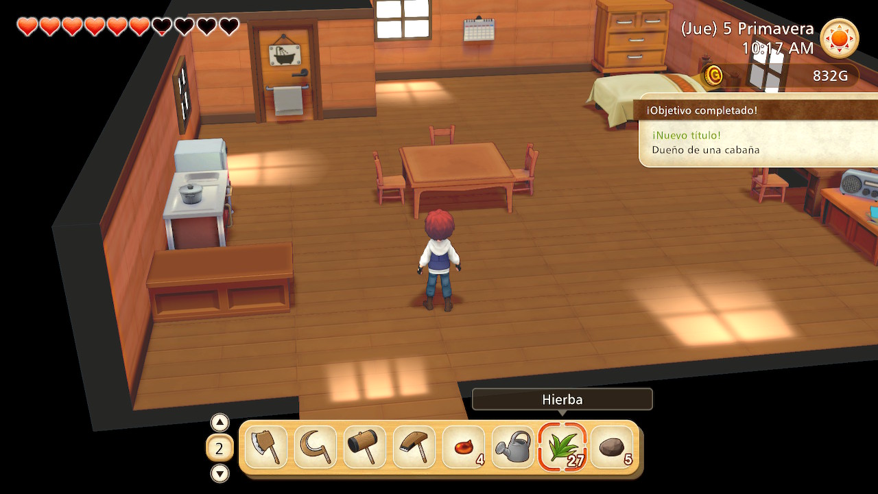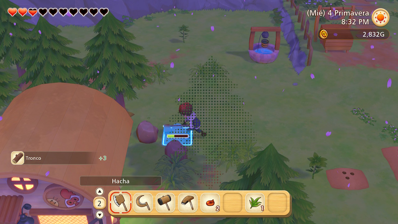 En nuestro pequeño rancho tendremos prácticamente todo lo necesario para avanzar en nuestra historia. El campo a nuestra disposición puede parecer limitado, pero la clave será saber gestionar bien ese terreno de trabajo. La necesidad de labrar, regar y recolectar será constante; los alimentos fruto de nuestro trabajo no solo nos servirán para elaborar platos para restaurar la resistencia de nuestro avatar y que podamos seguir realizando acciones, sino que también podremos comerciar con estos elementos en una caja situada junto a nuestra cabaña. Junto a esto, también podremos explotar cuevas, algo necesario para extraer algunos materiales como piedras, hierro o cobre, entre otros. Y también tendremos a nuestra disposición un pequeño riachuelo en el que podremos pescar utilizando una caña.