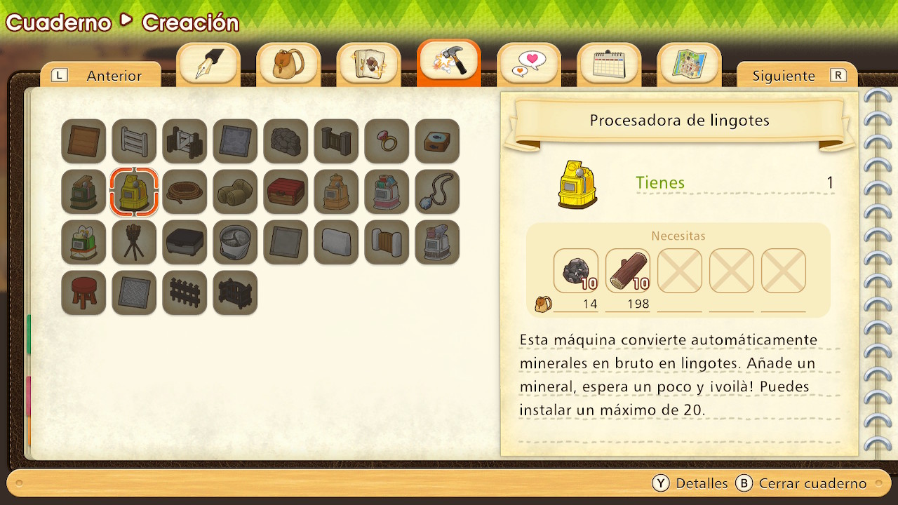 Otro elemento interesante en Story of Seasons: Pioneers of Olive Town es su sistema de crafteo. Aunque no es demasiado sofisticado, si es tremendamente funcional; desde nuestro menú podremos obtener nuevos objetos y elementos que nos servirán para mejorar el rendimiento de nuestra granja y seguir creciendo, aunque para esto tendremos que tener los materiales necesarios. Algunos elementos como hiladoras, telares o fundidoras de hierro serán útiles para conseguir objetos que serán indispensables para seguir avanzando en nuestra aventura. La única traba que encontramos aquí es cómo pasa el tiempo ya que puede hacerse algo tedioso, y para obtener algunos materiales vamos a tener que estar esperando horas o incuso hacer pasar el día.