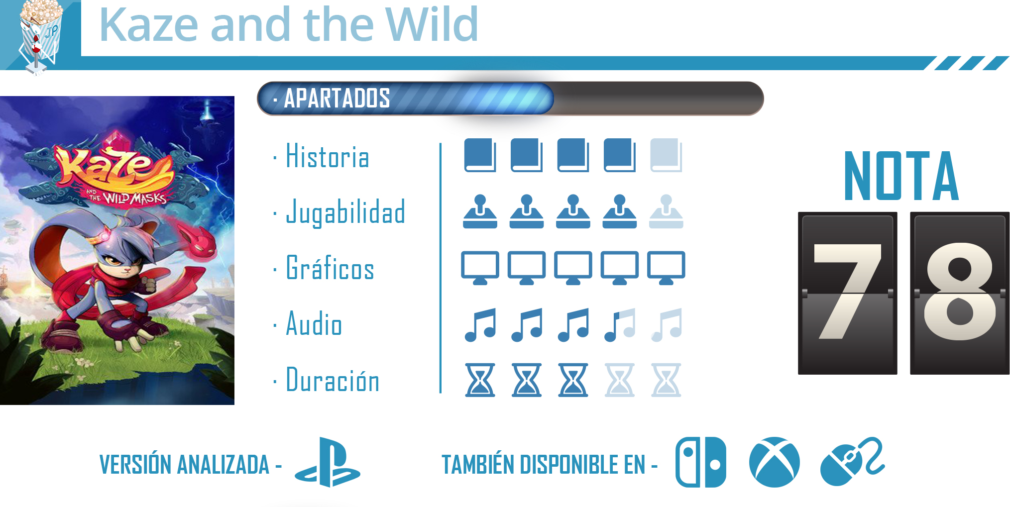 Kaze and the Wild Masks es un título de plataformas en 2D que consigue recuperar la esencia de esos juegos de los 90 con los que muchos crecimos y empezamos en este mundo, haciéndonos vivir autentica nostalgia. Todos los ingredientes de los clásicos del género se encuentra presentes y eso hace que sea un título muy recomendable para los amantes de los plataformas, aunque sin llegar a introducir novedades que reinventen una fórmula ya conocida por todos.