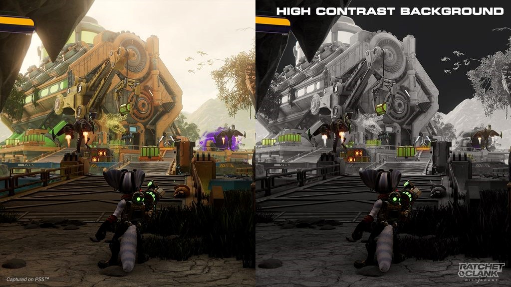 Las opciones de contraste de Ratchet & Clank: Una Dimensión Aparte están diseñadas para hacer que la información clave del mundo del juego se destaque para los jugadores ciegos o con problemas de visión. Estas características se incluyeron en Marvel’s Spider-Man: Miles Morales y se adaptaron para esta nueva entrega. Esta sección del menú incluye, además, un fondo de alto contraste y sombreadores para habilitar variedad de categorías; los jugadores pueden usar cada configuración de forma independiente o usarlos juntos.