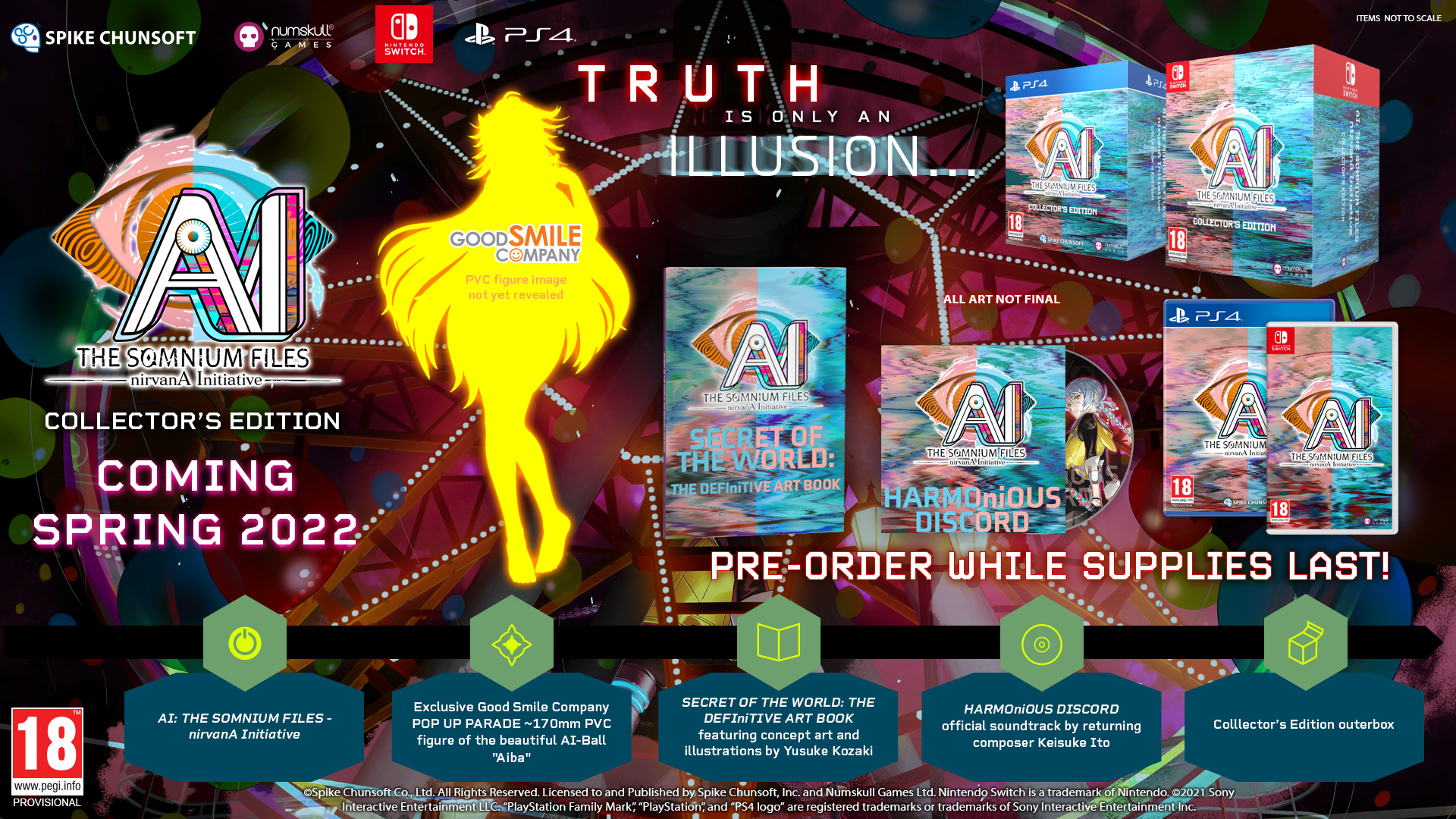 AI: THE SOMNIUM FILES – nirvanA Initiative llegará en dos ediciones, una estándar y en una preciosa Collector´s Edition que hará las delicias de los fan de esta magnifica aventura. Esta edición incluye una copia de AI: The Somnium Files – nirvanA Initiative, una figura exclusiva de Good Smile de 17 CMs de ‘Aiba’, un libro de arte ‘SECRET OF THE WORLD: THE DEFIniTIVE ART BOOK’ y la banda sonora ‘HARMOniOUS DISCORD’.