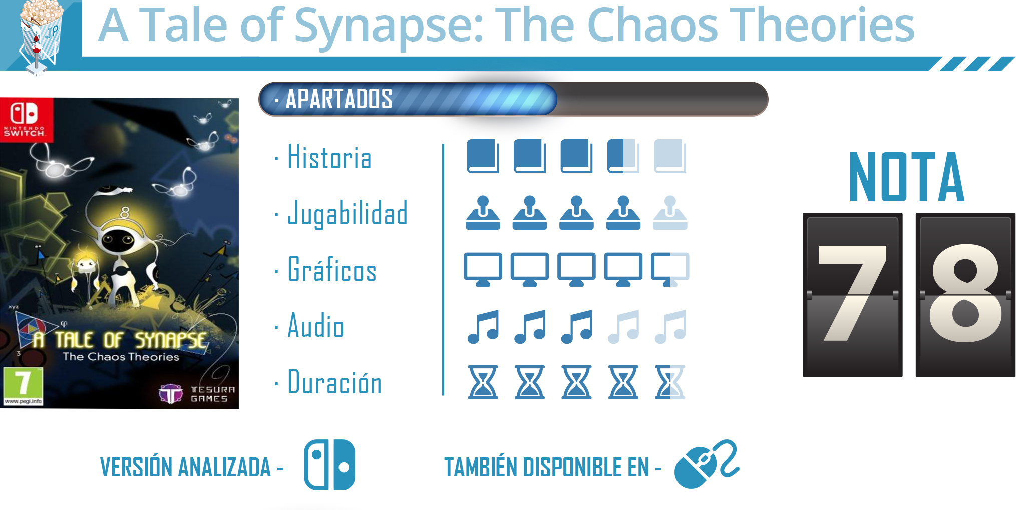 A Tale of Synapse: The Chaos Theories es una obra interesante y curiosa. Souris-Lab nos presenta un estimulante y original juego de plataformas en 2D sencillo, cuya máxima es la resolución de puzles. Es un título que busca estimular al jugador a base de esos retos, muchos de ellos matemáticos, cuyo resultado es una experiencia satisfactoria, sobre todo si somos fans de este género. Todo ello se acompaña de un curioso apartado gráfico y estético, y de un campo musical que se muestra de manera correcta, dando como resultado un título ameno que nos invita a recorrer se mundo onírico y con el que nos divertiremos durante el viaje de estos dos simpáticos seres mientras buscan restaurar la paz.