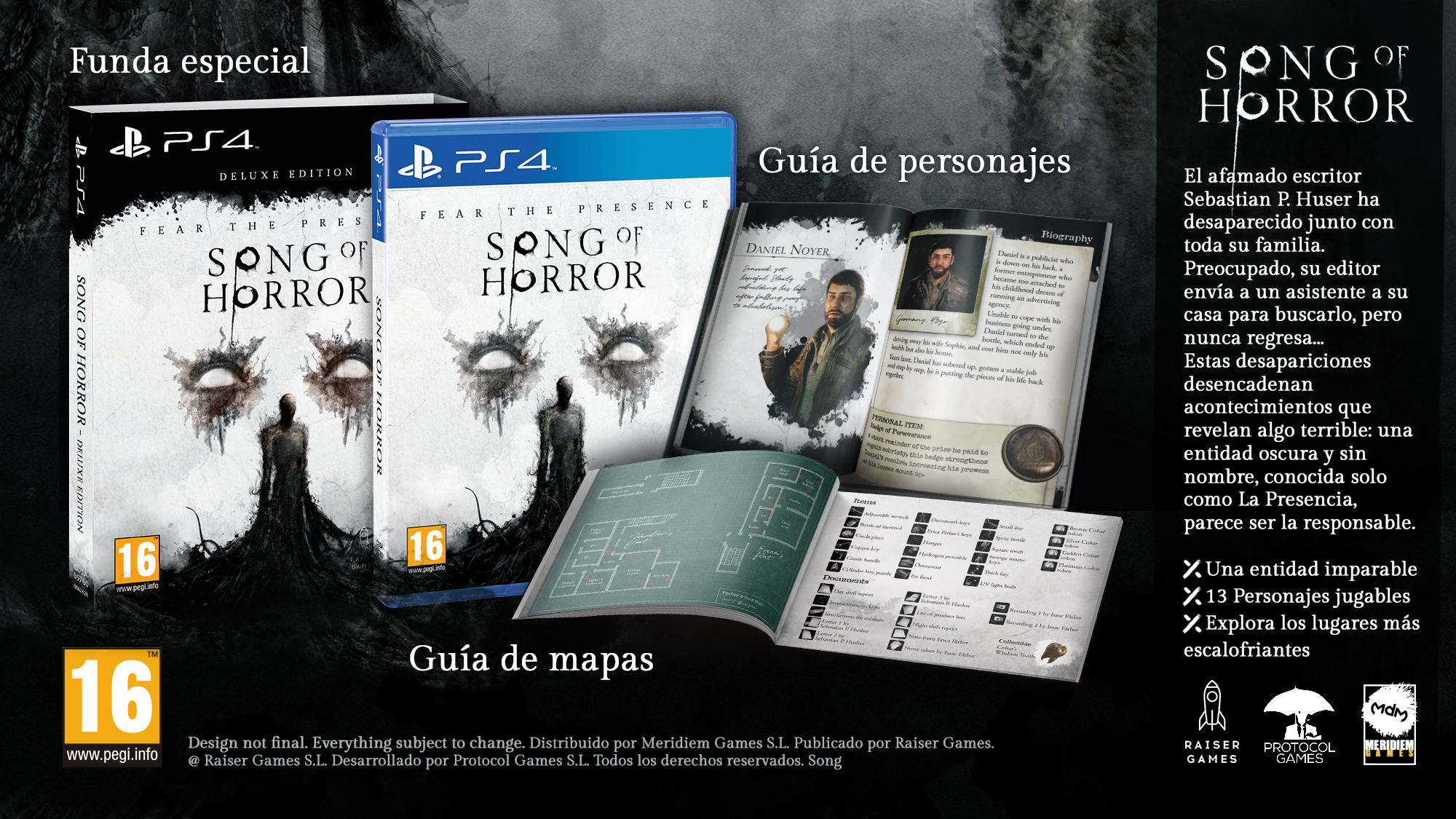 Song of Horror ya se encuentra a la venta en formato digital para PlayStation 4, Xbox One y PC. La versión física, distribuida en España por Meridiem Games, está disponible en una edición Deluxe que contiene una copia del juego, una funda especial con la ilustración de La Presencia, una guía de mapas con pistas y ayudas y una guía de personajes que recopila todas las curiosidades sobre los 13 protagonistas jugables.