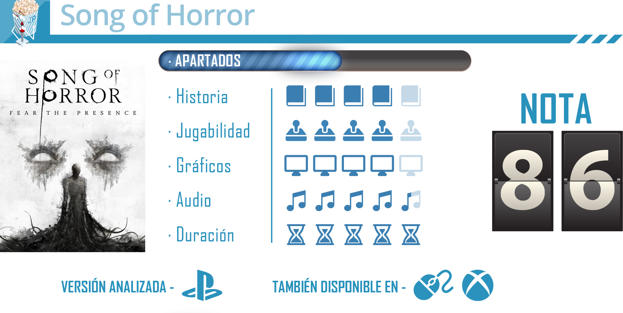 Con un total de cinco capítulos, incluido su prólogo, completar Song of Horror es toda una odisea, una aventura terrorífica y muy visceral que nos pondrá los pelos de punta durante sus 12-15 horas que puede durarnos completar sus diferentes escenarios.