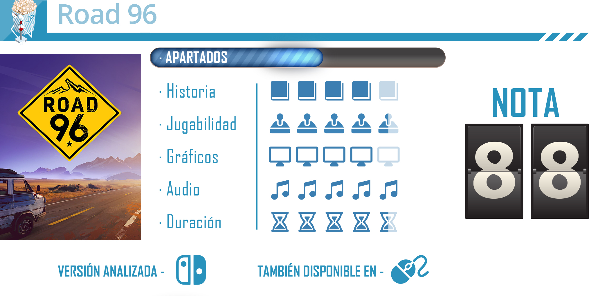 Road 96 es uno de esos títulos difíciles de calificar o englobar en un género. Tenemos claramente un juego que se centra en la narrativa, pero lo hace de una forma que rompe con otros títulos más convencionales ya vistos al añadir ciertos elementos procedurales. Es un titulo que, como hemos comentado, no se corta a la hora de meterse en temas políticos y criticarlos y esto lo hace bastante especial. Todo ello se encuentra acompañado de un aspecto estético de calidad, pese a su rendimiento, y un apartado sonoro igual de bueno, dando como resultado un juego que puede puede traducirse como una autentica expriencia muy recomendable.