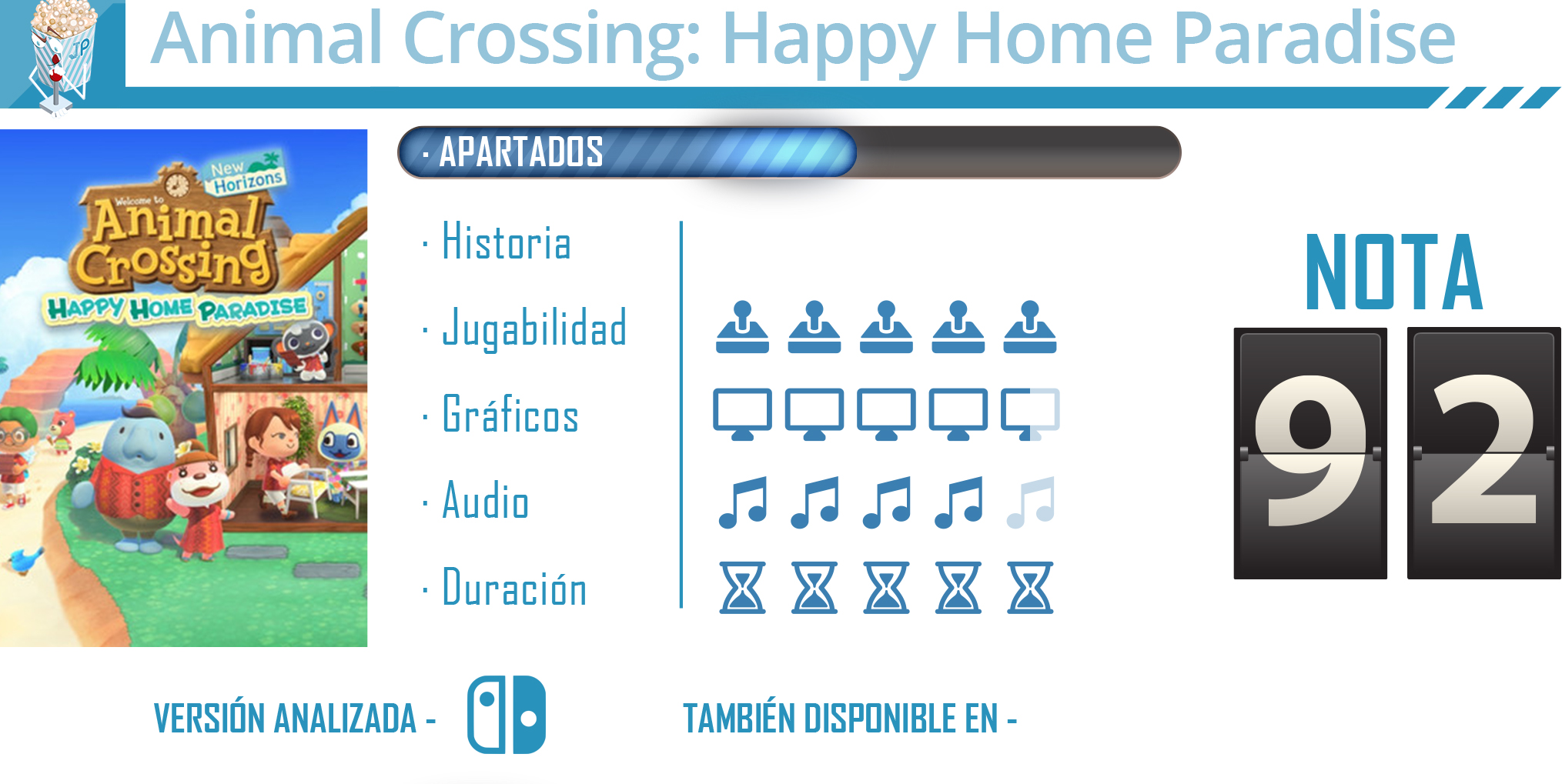 Happy Home Paradise era algo necesario para Animal Crossing: New Horizons. Después de más de un año en el mercado, el último título de la franquicia de Nintendo necesitaba un empujón para que los jugadores siguiesen enganchados, pero también para atraer a otros nuevos. Gracias a sus numerosas mejoras y añadidos, este DLC, junto a la actualización 2.0 gratuita, dan al juego base nuevo aire y hace que volvamos a ilusionarnos por visitar su gran mundo. La inclusión de elementos ya vistos en Happy Home Designer le sientan realmente bien a esta entregan, permitiéndonos ejercer nuevos roles dentro de nuestro papel como constructor y gestor. Los nuevos elementos, aldeanos, herramientas y diversas opciones son todo un aliciente que nos invitan a volver a invertir un gran número de horas, mientras descubrimos todas las posibilidades que aguarda en este gran y único mundo.