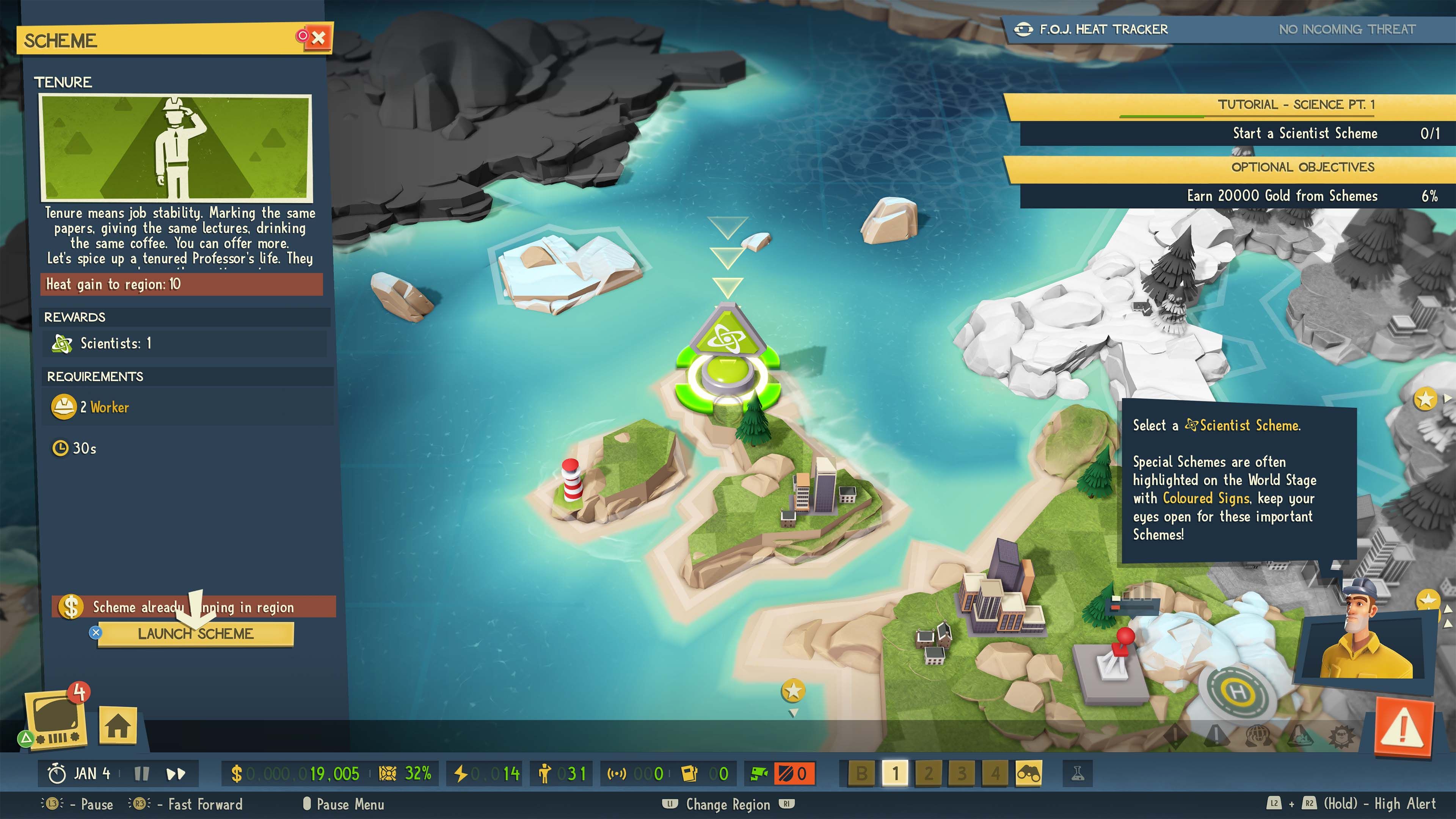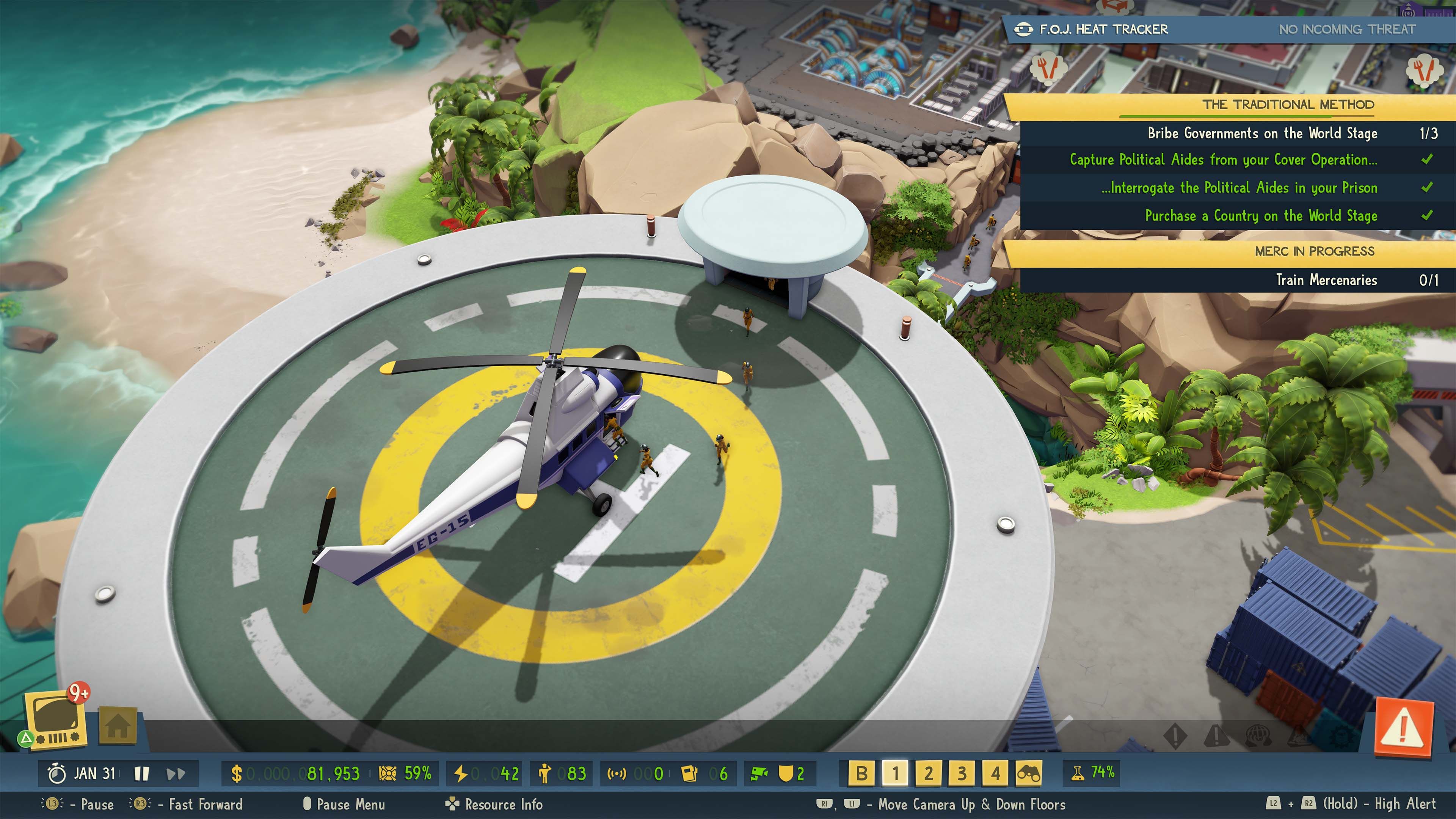 La isla va a ser nuestra base de operaciones. Desde aquí deberemos realizar varias acciones y misiones, de forma encubierta, para llevar a cabo nuestros planes de dominación mundial. Como clásico juego de estrategia y gestión, tendremos un tutorial inicial que nos enseñará las nociones básicas del juego: saber cómo construir, dar órdenes y obtener recursos, son algunas de las claves que nos irá presentando el juego poco a poco.