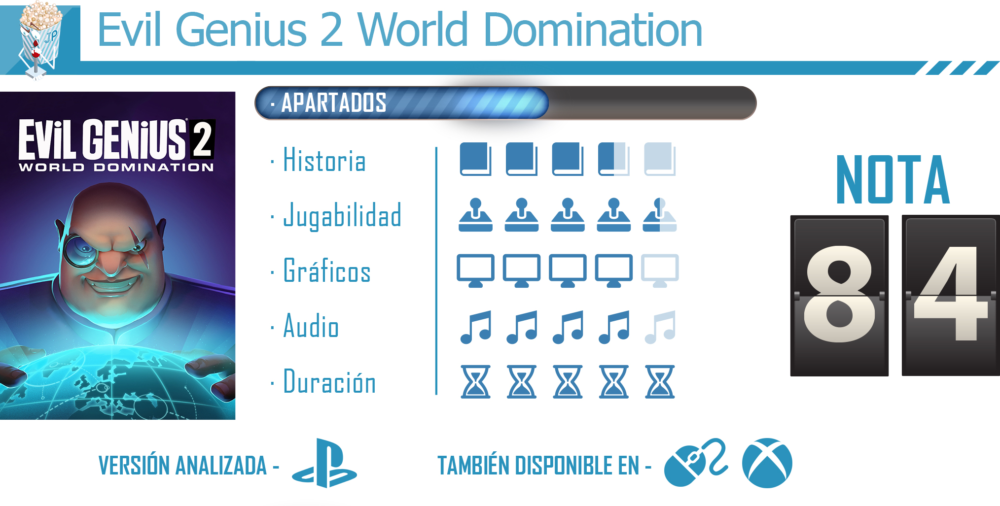 Evil Genius 2 World Domination es un título ciertamente algo continuista, comparado con la primera parte, pero también es un juego de gestión y construcción único y con una temática que lo hace muy atractivo, si lo comparamos con otros juegos parecido. No son muchos los juegos de esta índole que llegan a consola, por ello recibimos con los brazos abiertos una propuesta tan original como esta, que nos ofrece horas y horas de diversión mientras buscamos llevar a cabo nuestros planes de dominación mundial.