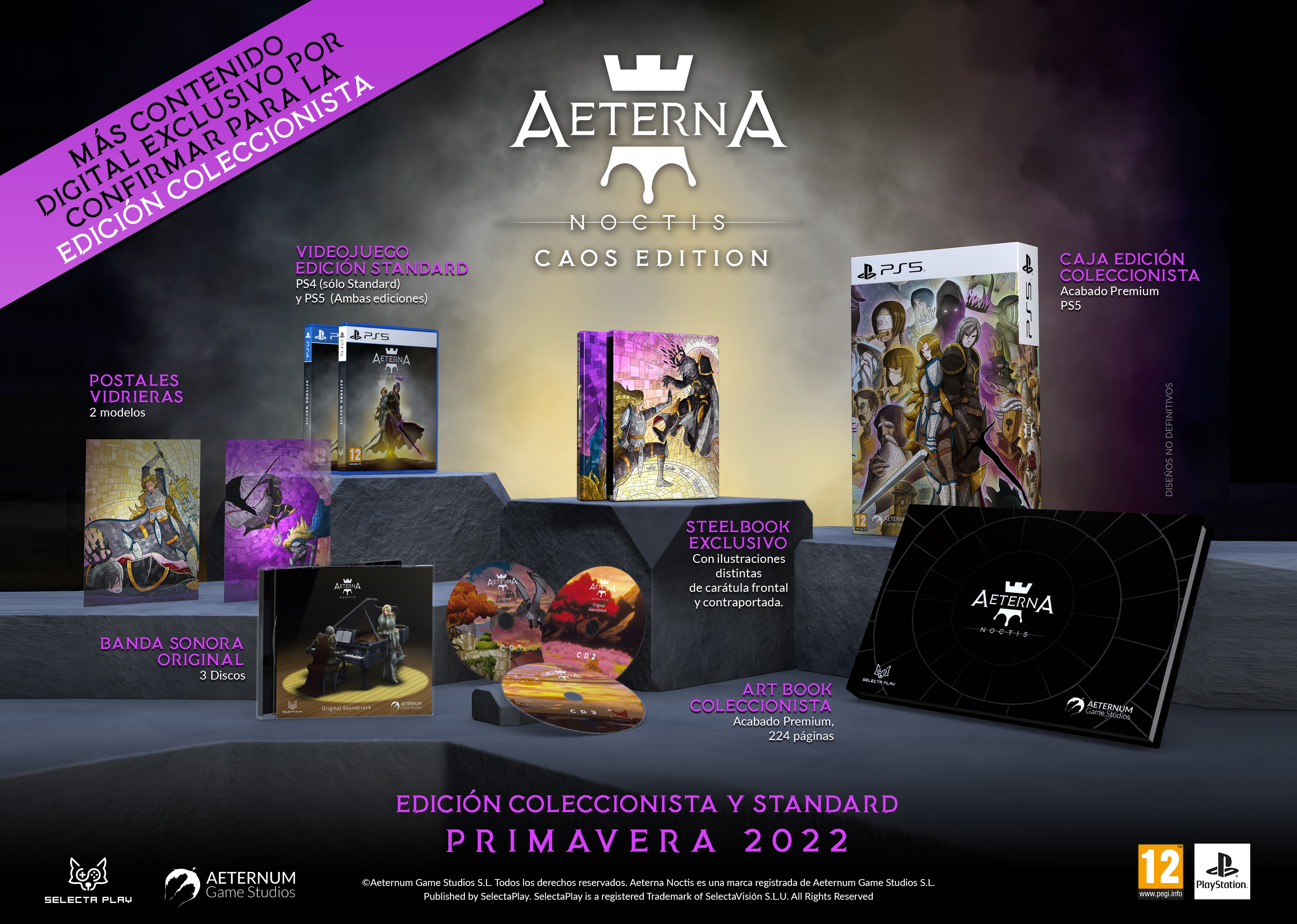 Disponible en la primavera-verano de 2022, aquellos que reserven la Edición Caos ahora encontrarán incluida una versión Steelbook del juego exclusiva para cada plataforma, dos postales de vidrieras, la banda sonora original de tres discos y un libro de arte de edición de coleccionista premium que contiene más de 224 páginas. Todo incluido en una caja de edición de coleccionista con un acabado de gran calidad.