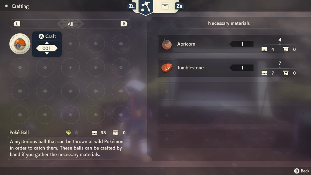 Todos estos elementos que podemos recoger servirán para craftear nuevos elementos. Es evidente que también podremos comprar recursos y objetos en Villa Jubileo, pero también podremos crearlos. En el banco de artesano podremos utilizar, previa obtención de la receta necesaria, algunos objetos como pociones, diferentes tipos de Pokéballs y otros elementos que nos servirán para proveernos para nuestra aventura. Este tipo de opciones añaden un plus más a nuestra aventura, dotando, aunque sea de una forma muy superficial, de cierto componente de supervivencia y gestión al título.