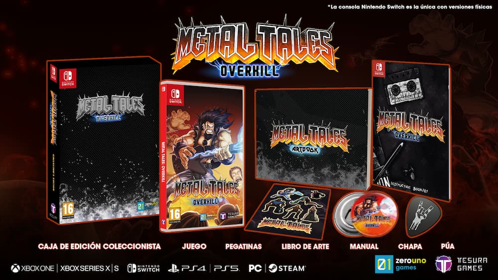 Además de las versiones digitales, habrá dos ediciones físicas especiales para Nintendo Switch de Metal Tales: Overkill disponibles para cumplir tus fantasías de Dios del Rock. La Edición de Deluxe, publicada por Tesura Games, incluirá un manual impreso a todo color, una púa de guitarra temática y una impresionante hoja de pegatinas, todo en la caja.