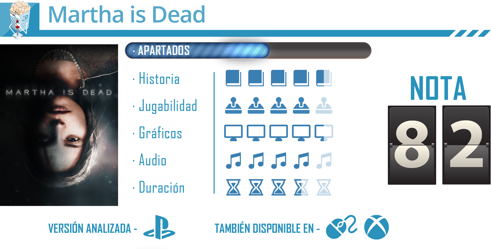 Martha is Dead es un título valiente, insólito y diferente. LKA apuesta por ofrecernos un juego de terror único y lejos de otras propuestas similares que toman la mecánica e loas walking simulator para desarrollar su argumento. En lugar de utilizar los jumpscares y los sustos fáciles, el estudio italiano mide mejor el nivel de terror del juego, pero se adentra más en lo grotesco y lo visceral, con el fin de trasmitir al jugador una atmosfera aún más cruda y macabra. Todos estos elementos se van mezclando poco a poco con ese misterio que se va construyendo y que logra enchanchar al jugador.